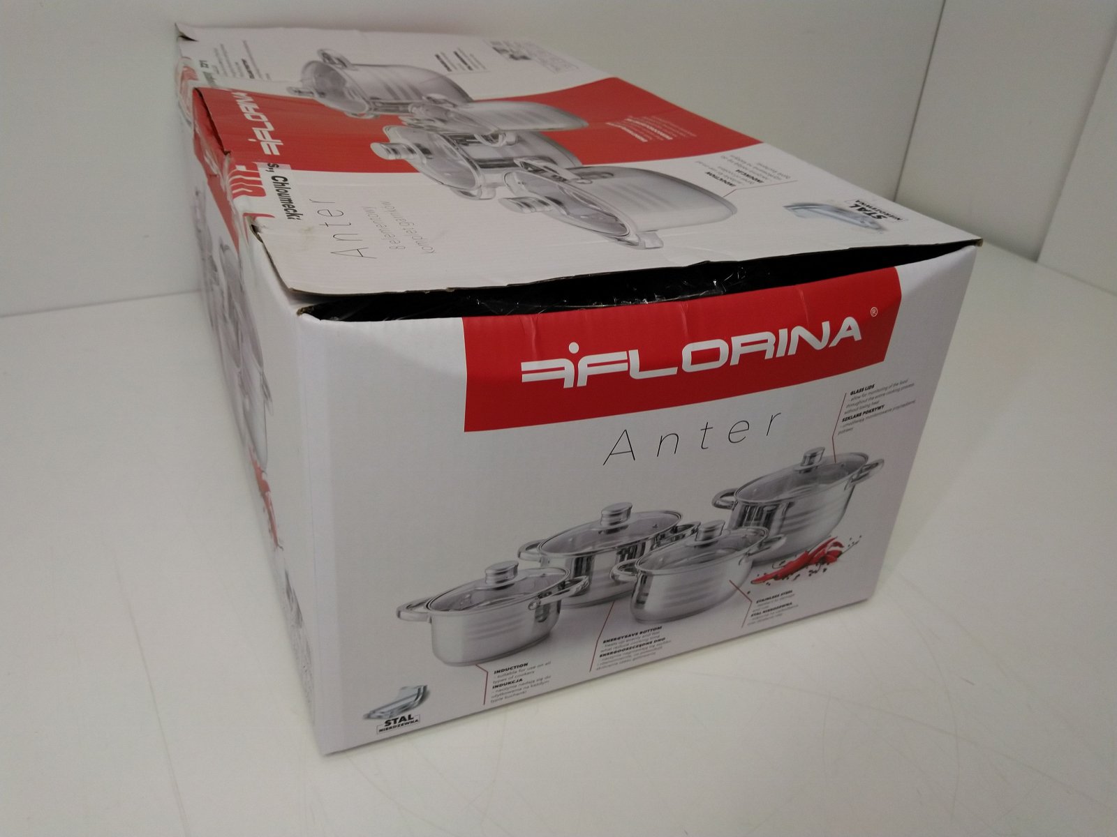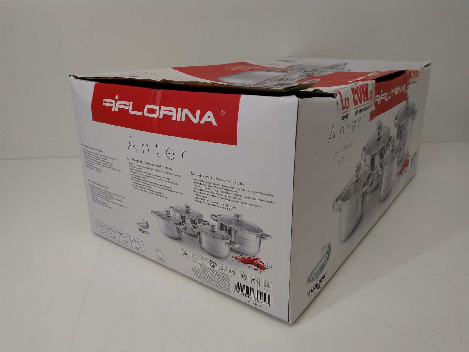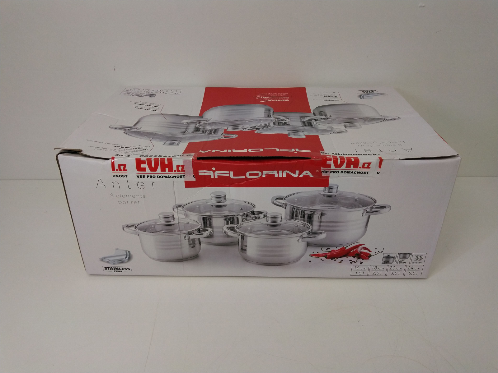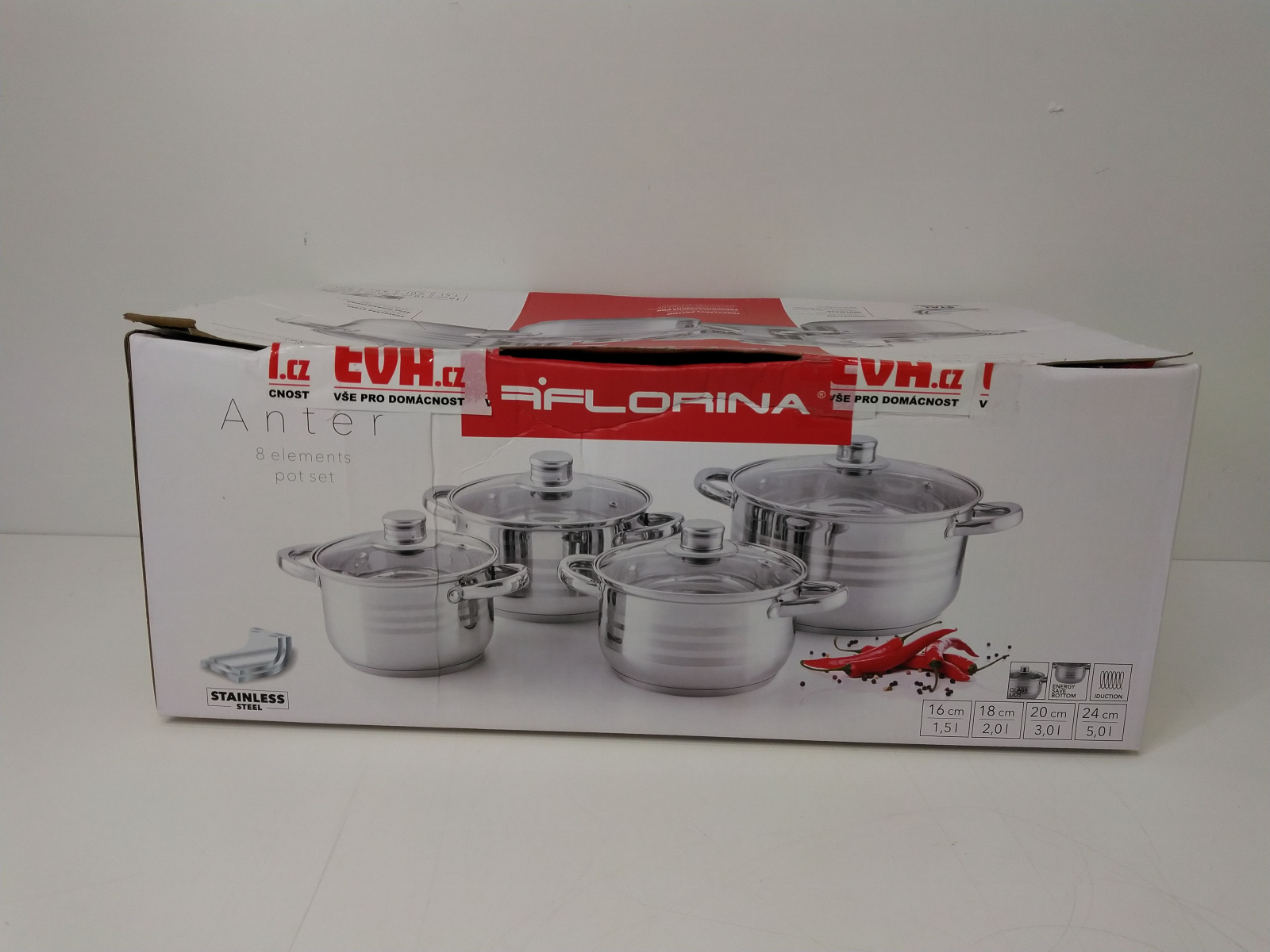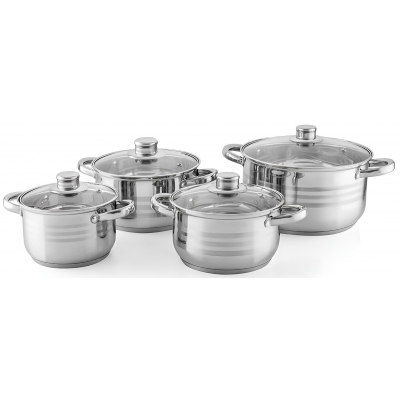 Sada nádobí Florina, venkovní povrch je leštěný se třemi matovanými proužky, materiál nerezová ocel 201, tloušťka stěny 0,4 mm, nýtované úchyty, skleněné poklice s otvorem pro únik páry, vícevrstvé dno o tloušce 0,5 mm hliník, 2,5 mm železo a 0,5 mm hliník, vhodné na všechny typy celý popis ohřevu včetně indukce, lze mýt v myčce na nádobí, sada obsahuje hrnec s poklicí o průměru 16 x 10,5 cm, objem 1,5l, průměr 18 x 11,5 cm, objem 2l, průměr 20 x 12,5 cm, objem 3l, průměr 24 x 14,5 cm, objem 5l.