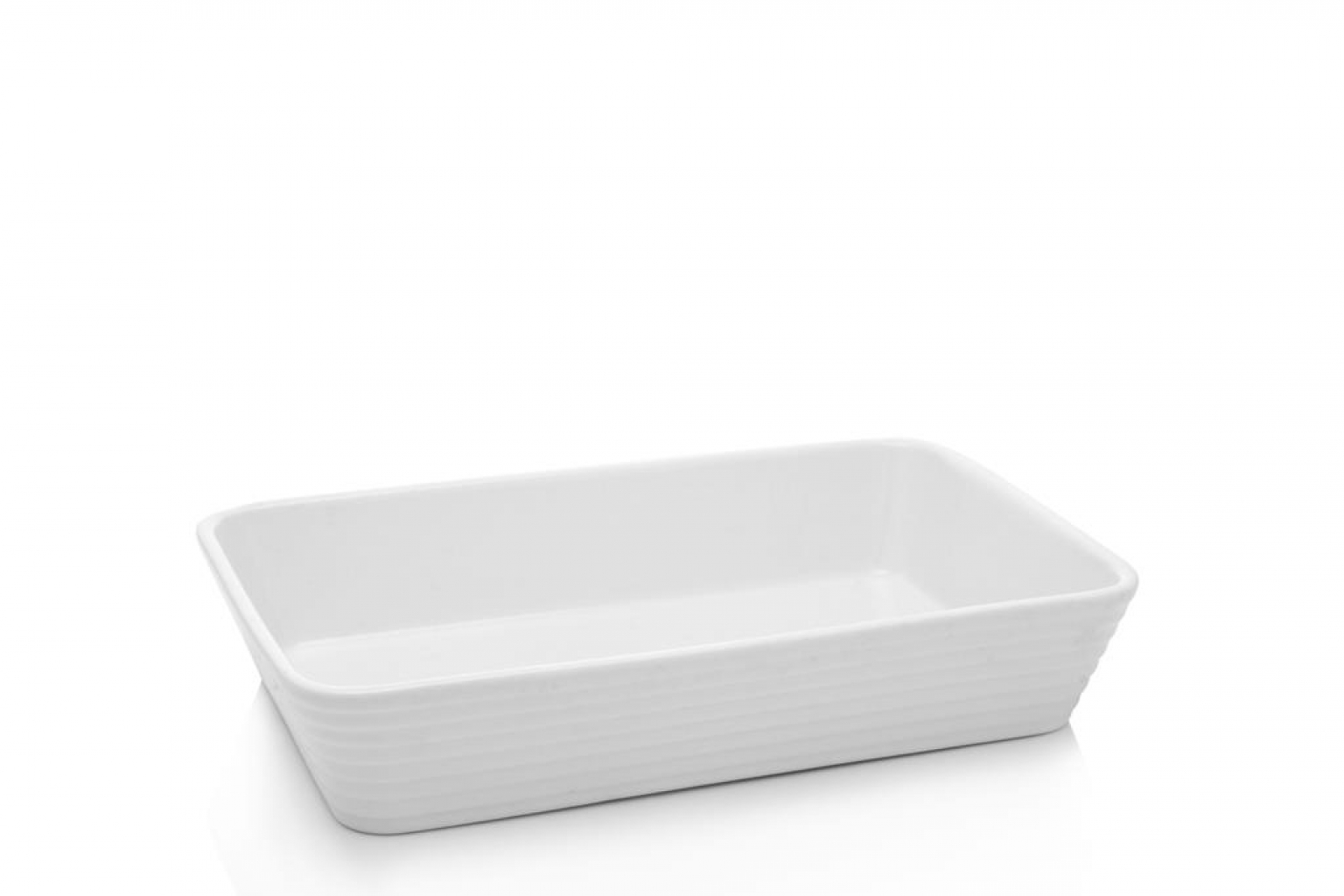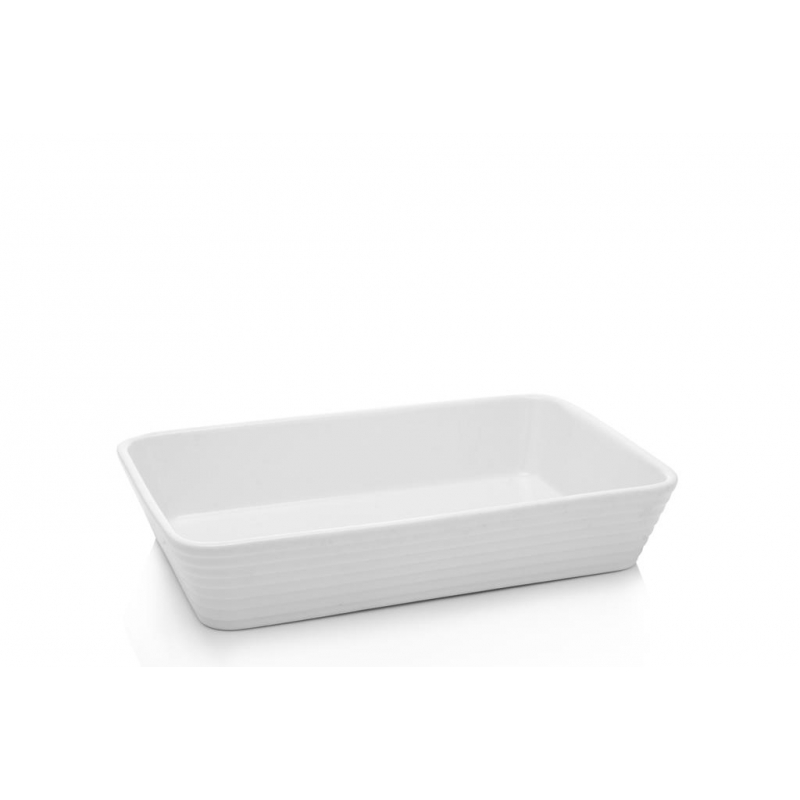 Keramická obdélníková zapékací forma, vnější povrch je s vlnkovým reliéfem, rozměry: 25 x 15,5 x 5 cm, keramika patří mezi oblíbené materiály ověřené mnoha generacemi, rovnoměrně absorbuje teplo a postupně ho uvolňují, díky čemuž se pokrmy dobře propečou.