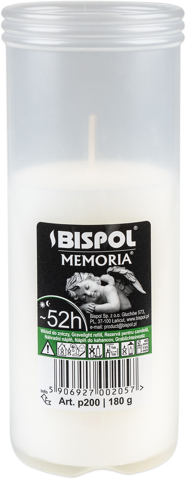 Náplň náhradní parafínová do hřbitovních lamp. Rozměr 6 x 15,5 cm, hmotnost 180 g, doba hoření 52 hodin.
