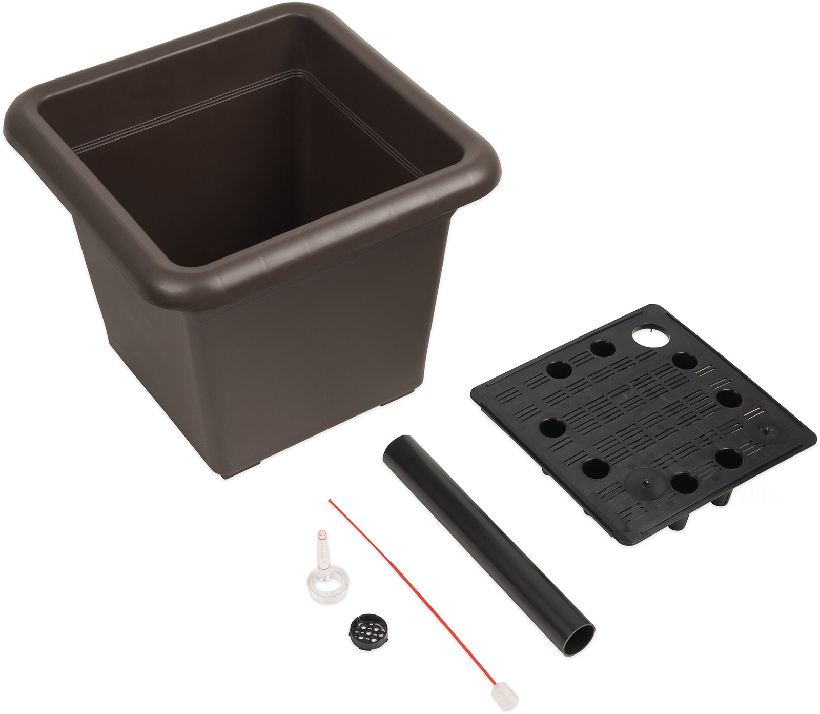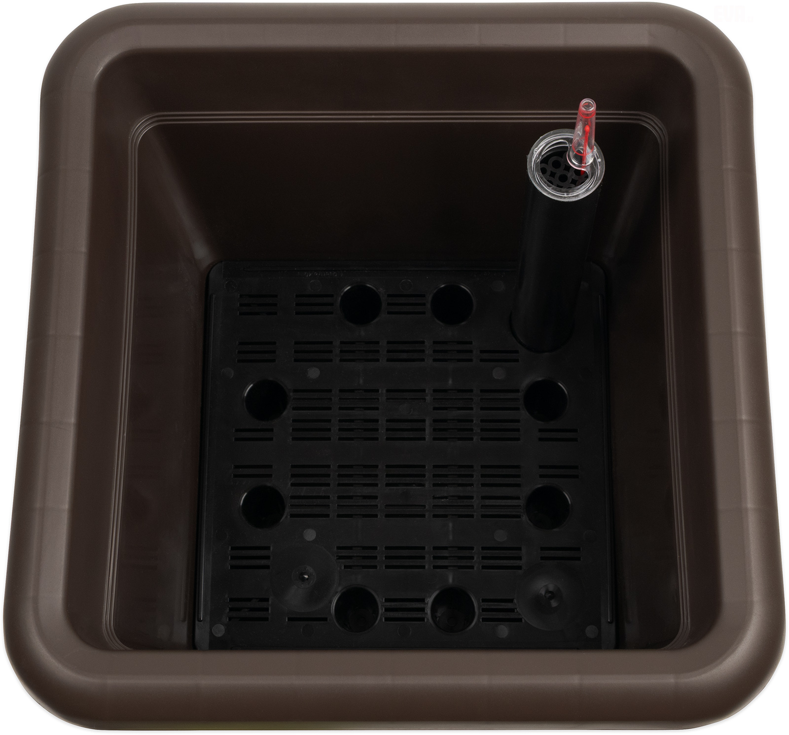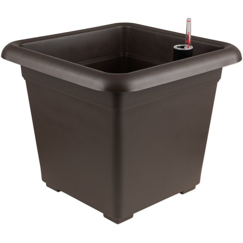 Samozavlažovací čtvercový květináč v hnědé barvě, součástí balení je nalévací trubička s ukazatelem výšky hladiny vody. Na dně květináče je vyjímatelný rošt, který v květináči vytvoří zásobník vody a rostlina tak může čerpat vláhu postupně. Stojí na 4 nízkých nožičkách, které jso celý popisu jeho součástí. Používá se v interiéru i v exteriéru, rozměry 30 x 30 x 25 cm.
