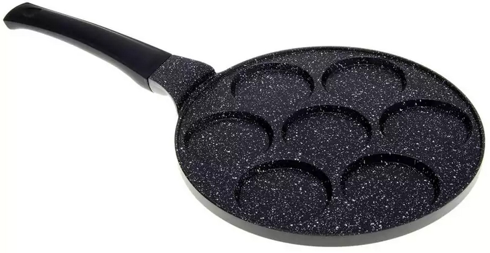 Pánev na volská oka nebo lívance je odlévaná masivní pánev se sníženým okrajem a s velmi kvalitním nepřilnavým povrchem PFLUON, je určena pro přípravu sázených vajec, bramboráčků, lívanečků atd. s minimální potřebou tuku, sedm sekcím, plastové držadlo s otvorem pro možnost zavěše celý popisní, průměr pánve 26 cm, výška 0,5 cm, průměr jedné sekce 8 cm, vhodná na všechny typy spotřebičů včetně indukce, lze mýt v myčce na nádobí.