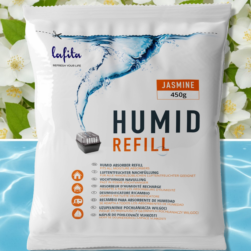 Náhradní náplň 450 g s vůní jasmínu do pohlcovačů vlhkosti. Granulát pohlcuje vlhkost ze vzduchu, která se ukládá v plastové nádobce pohlcovače. Granulát postupně snižuje účinnost a po vyčerpání jeho účinků je potřeba ho vyměnit. Trvanlivost je v místnosti do 20 m2 2-5 měsíců v z celý popisávislosti na vzdušné vlhkosti a teplotě vzduchu v místnosti. Velmi široké použití - využijete do všech výměnných odstraňovačů vlhkosti. Materiál: chlorid vápenatý, netkaná textilie z PP.