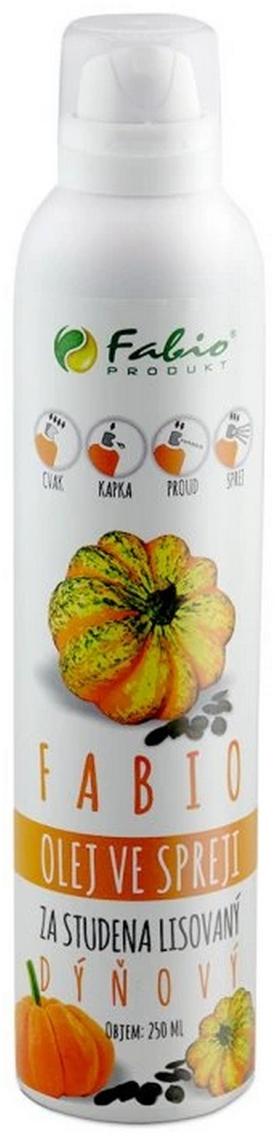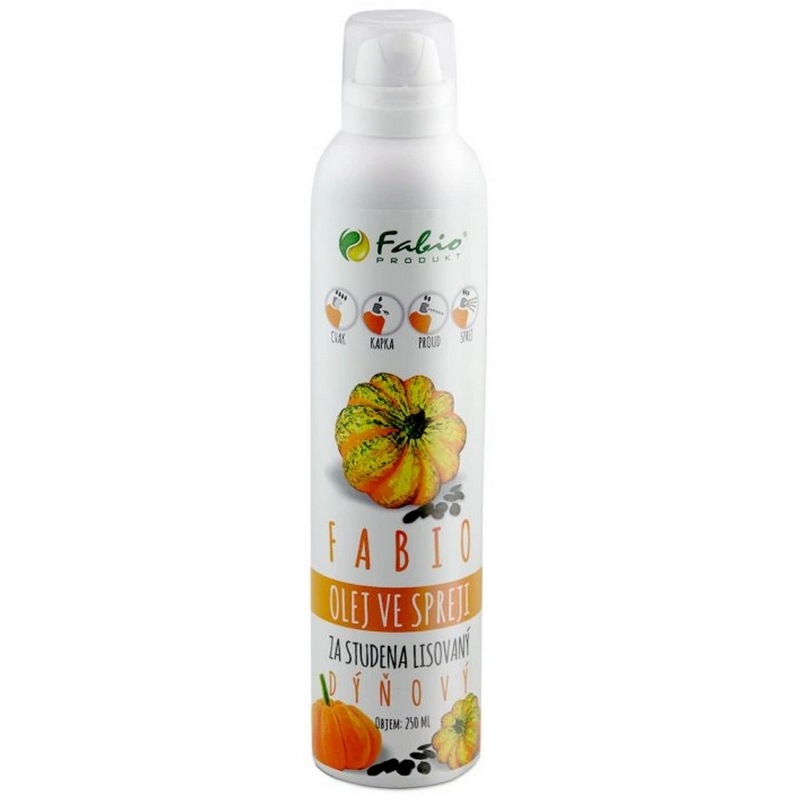 Dýňový olej ve spreji za studen lisovaný, 250 ml. Jedlý jednodruhový rostlinný olej. Složení: Složení: 100% olej z dýňových semen lisovaný za studena. Pro krátkodobé tepelné zpracování a ke konečnému dochucení pokrmů. Nádoba je pod tlakem: při zahřívání se může roztrhnout.Chraňte celý popis před teplem, horkými povrchy, jiskrami, otevřeným ohněm a jinými zdroji zapálení. Zákaz kouření. Nepropichujte nebo nespalujte ani po použití. Chraňte před slunečním zářením. Nevystavujte teplotě přesahující 50°C/122°C. Uchovávejte mimo dosah dětí.