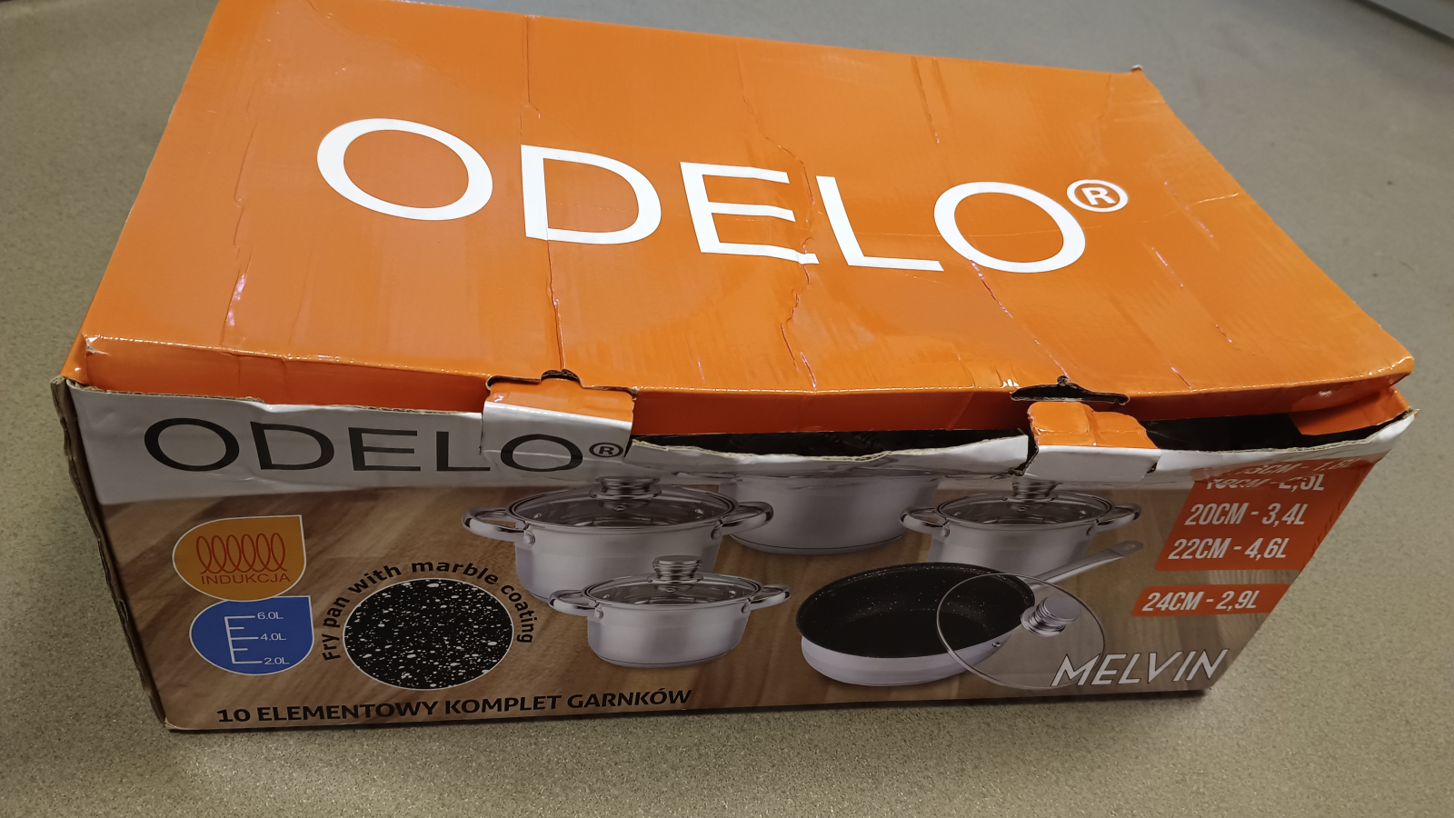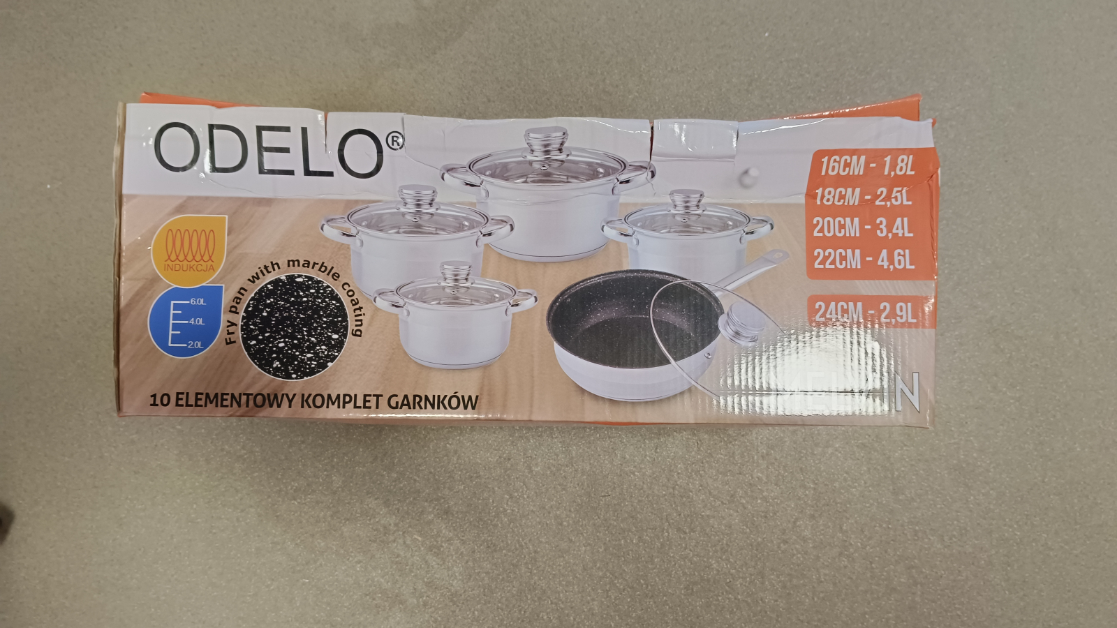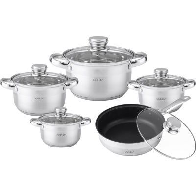 Sada nádobí Odelo s poklicí, tloušťka stěny 0,3 mm, sada obsahuje 4 hrnce a pánev s poklicí ve velikostech: průměr 16cm objem 1,8l, průměr 18cm objem 2,5l, průměr 20cm objem 3,4l, průměr 22cm objem 4,6l, pánev průměr 24cm objem 2,9l. Skleněné poklice s otvorem pro únik páry, vhod celý popisné na všechny typy ohřevu včetně indukce, materiál nerez, termické dno, které drží teplo, poklice s ocelovou úchytkou, měrka hladiny vody uvnitř hrnců, lze mýt v myčce na nádobí, hmotnost 5,71kg.
