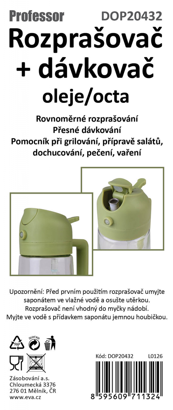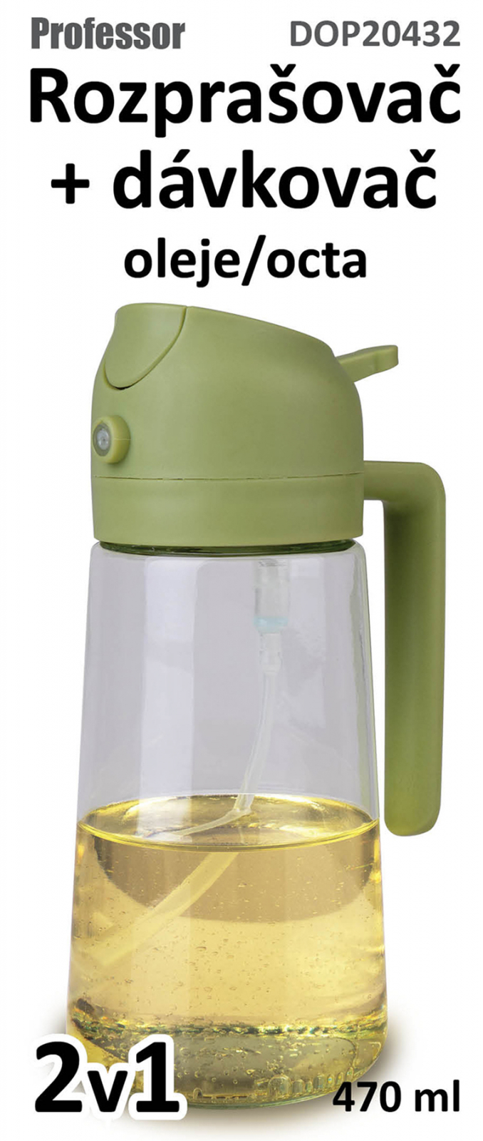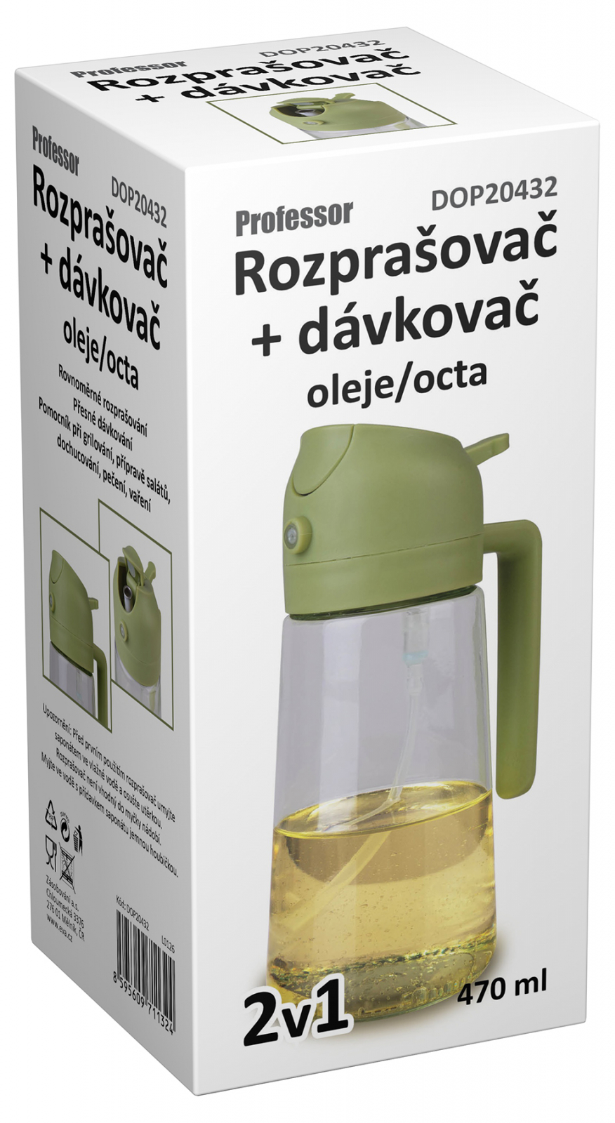 Rozprašovač oleje nebo octa se skleněnou nádobou o objemu 470 ml využijete při grilování, přípravě salátů, dochucování, pečení, vaření. Systém 2v1 umožní opravdu rovnoměrné rozprášení oleje nebo octa nebo jejich přesné dávkování. Rozprašovač snadno naplníte díky širokému hrdlu ná celý popisdoby. Rozměry včetně madla: 10,5 x 18,5 x 7,8 cm, hmotnost: 239 g. Nejlépe se rozprašuje olej, který má pokojovou teplotu (ne ztuhlý z lednice).