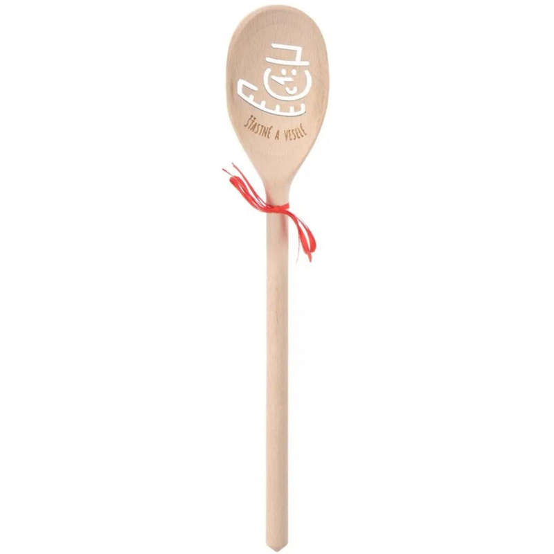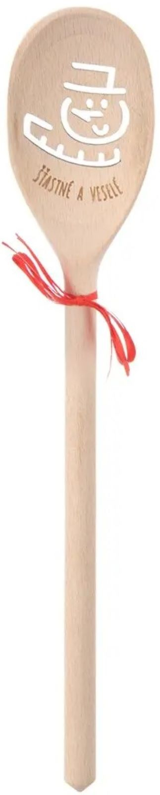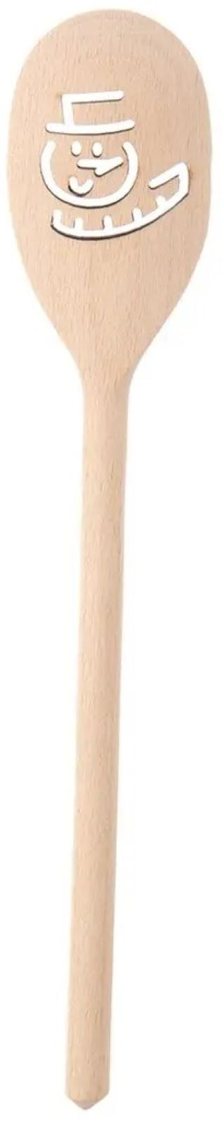 Oválná vařečka s vypalovaným dekorem sněhuláka a nápisem "ŠŤASTNÉ A VESELÉ", je vyrobena z bukového dřeva, šířka 5,5 cm.