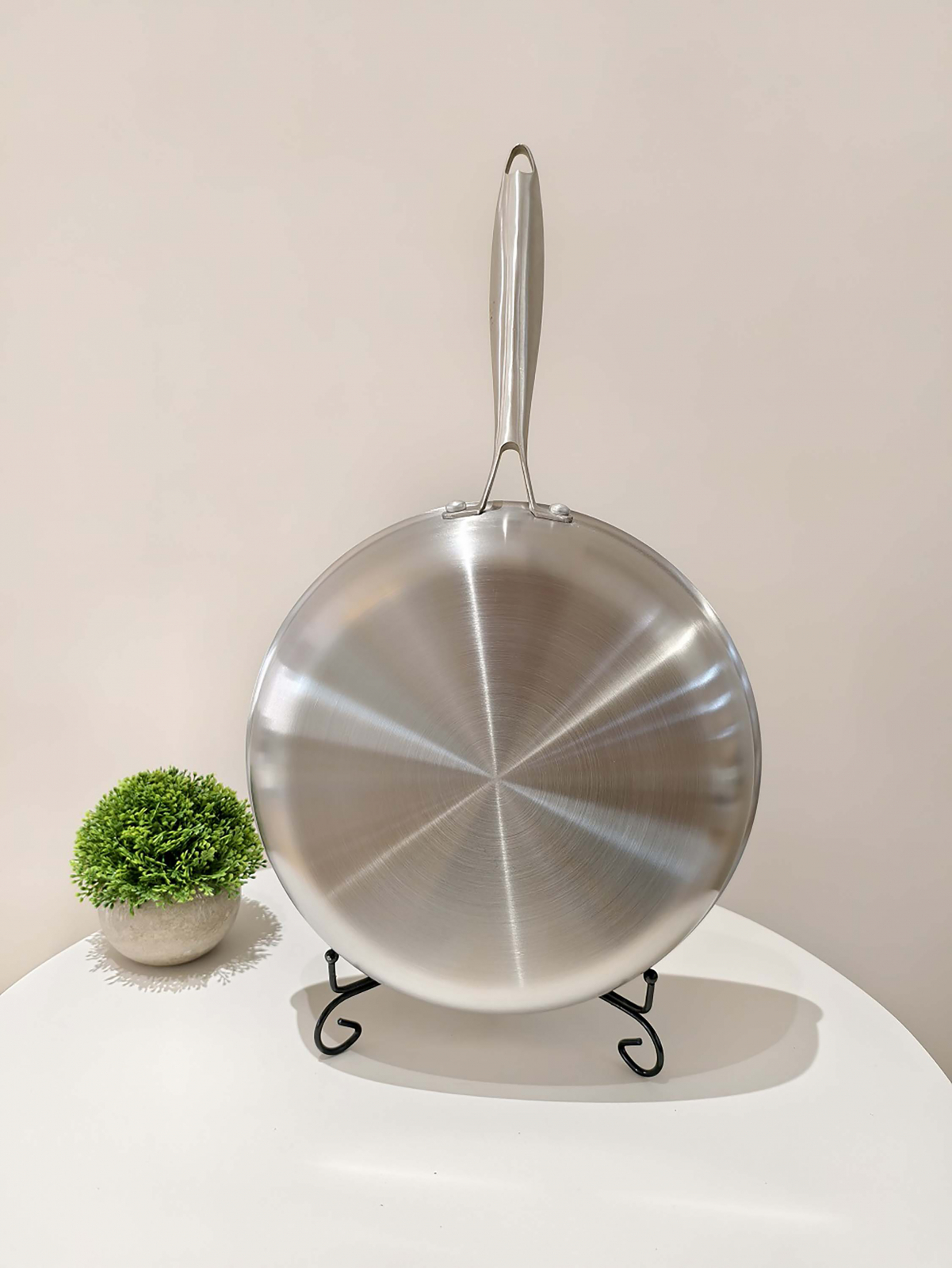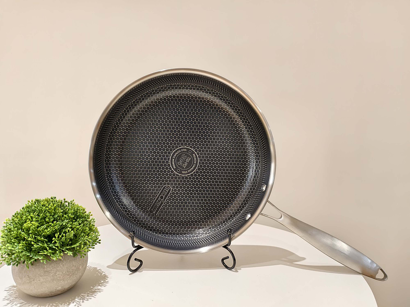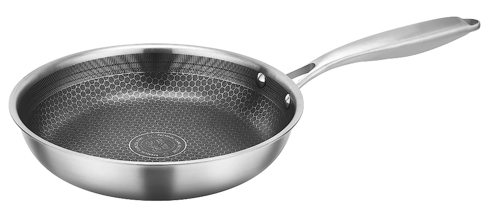 Pánev KITCHISIMO kombinuje nepřilnavý povrch a nerezovou ocel. Vzhledem k tomu, že nádobí má mnoho bodů, které mají vrstvu povrchu navíc, má větší tepelnou konzervaci a vyšší přenos tepla než obvyklé nádobí. Nepřilnavý povrch, Vám poskytne snadnější čistění ve srovnání s ostatní celý popism nádobím z nerezové oceli. Možnost zavěšení. Je vhodná na všechny typy spotřebičů, do trouby do max. teploty 260 °C, vhodná do myčky na nádobí. Materiál: 3vrstvé nádobí - vnitřní kvalitní nerez s nepřilnavým povrchem, hliník, vnější nerezová vrstva. Rozměry: vnější průměr 21,5 cm, vnitřní průměr 20 cm, průměr indukčního dna 15 cm, šířka 39,5 cm, výška 4,5 cm.