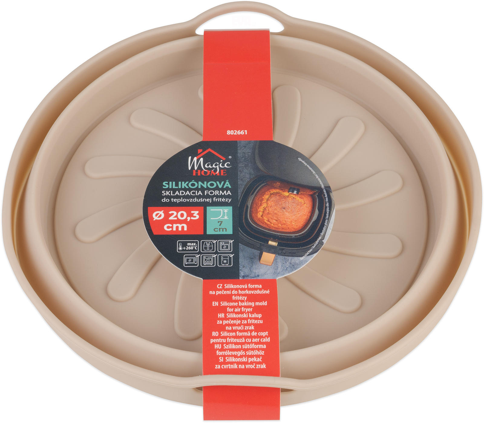 Silikonová forma pro horkovzdušné fritézy, po použití jednoduše složíte. Vyrobeno z odolného silikonu, odolný vůči teplotám -40 °C až +260 °C, průměr formy 20,3 cm, výška 7 cm. Formu je možné použit v elektrické, plynové i horkovzdušné troubě, možnost mýt v myčce nádobí.