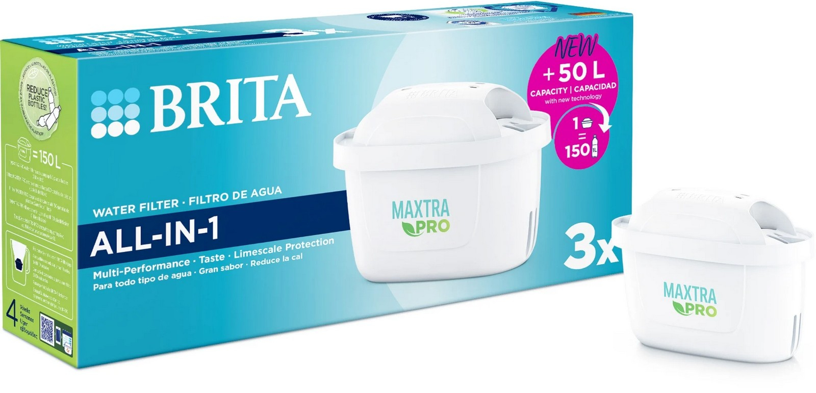 Vodní filtr Brita Maxtra Pro ALL-IN 1, , balení obsahuje 3 ks. Čistší, chutnější a svěží voda. Jeden filtr je určený na přefiltrování až 150 litrů vody, nebo až na 4 týdny používání. Filtr ideální pro lokality s měkkou až středně tvrdou vodou. Lepší chuť, méně vodního kamene, red celý popisukuje: chlór a jiné látky ovlivňující chuť, vodní kámen, olovo, měď, herbicidy, pesticidy a léčiva a jiné nečistoty. Filtr je založen z ryze přírodní technologii. Superjemná filtrační tkanina zachycuje částice, idální pro straré potrubí. Kompatibilní se všemi filtry na stolní vodu BRITA.