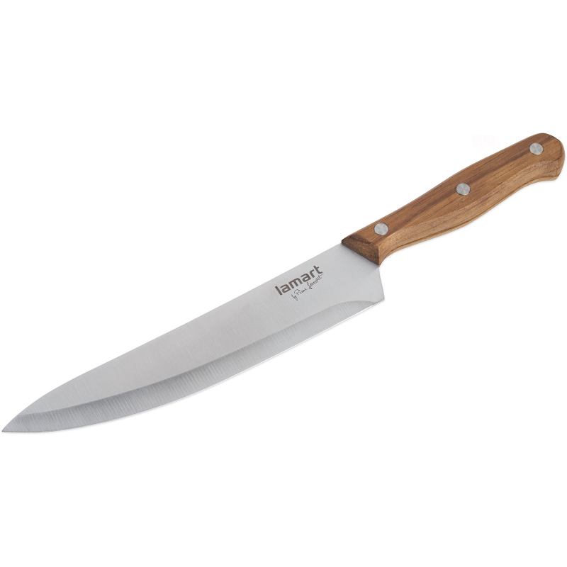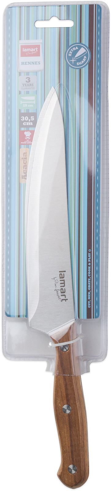 Nůž kuchařský, materiál nerez / dřevo, barva stříbrná / hnědá, délka ostří 19 cm, délka nože 30,5 cm, velmi ostrá čepel a ergonomická rukojeť pro maximální účinek a bezpečné užití. Neovlivňuje vůni a chuť krájených potravin.