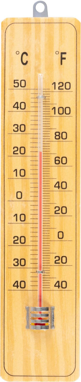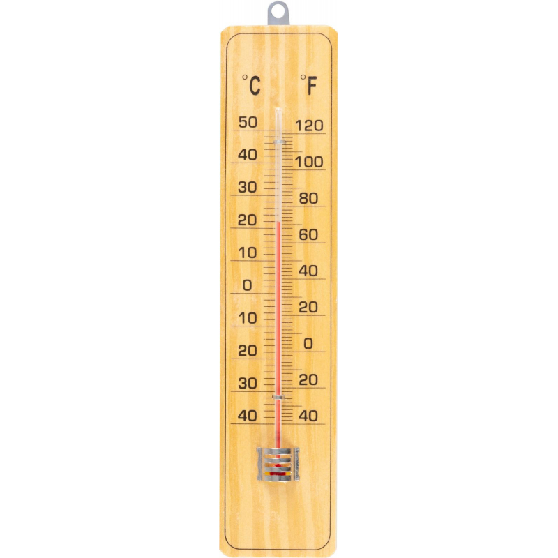 Venkovní teploměr s dřevěným podkladem. Na zavěšení nebo přišroubování, rozsah měření -40 až 50 °C, rozměry : 220 x 50 x 10mm.
