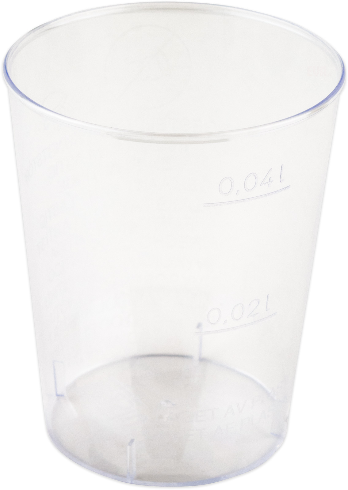 Čirý kelímek na nápoje, průměr dna 35mm, průměr hrdla 43mm, výška 55mm, objem 0,04. Cejch na 0,02/0,04l. Balení obsahuje 50ks.