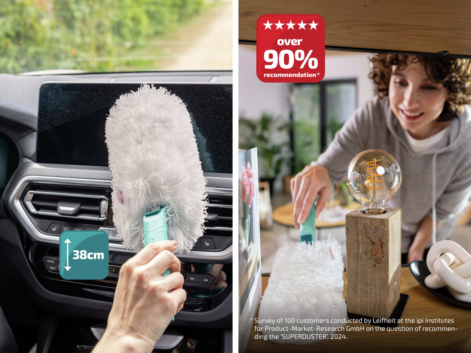 Prachovka SUPERDUSTER značky Leifheit. Pracovní délka 38 cm. Mikrovlákna přitahují a zachycují prach, vlasy a alergeny. Pružná a díky velikosti s ní pracuje velmi snadno, ideální pro všechny povrchy a výklenky. Potah prachovky je snímatelný a lze jej prát v pračce při 40 °C - až celý popis50x. Rukojeť je vyrobena z 96% recyklátu. Kompatibilní se všemi násadami Leifheit Click Systém.