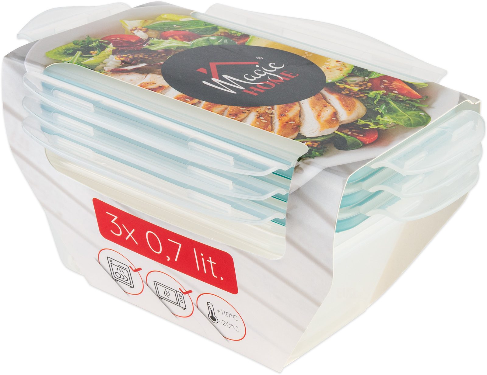 Praktická sada 3 dóz o objemu 0,7 l, rozměry 1 dózy: šířka 16 cm, výška 6 cm, hloubka 10,5 cm, dóza pro skladování a přenášení potravin, vyrobena z odolného plastu s kvalitním silikonovým těsněním víčka – vzduchotěsné a vodotěsné, potraviny zůstávají déle čerstvé, udržují si své celý popisaroma, při manipulaci nevytékají, vhodné do ledničky, mrazničky, mikrovlnné trouby a do myčky nádobí, teplotní rozmezí -20°C až 110°C.