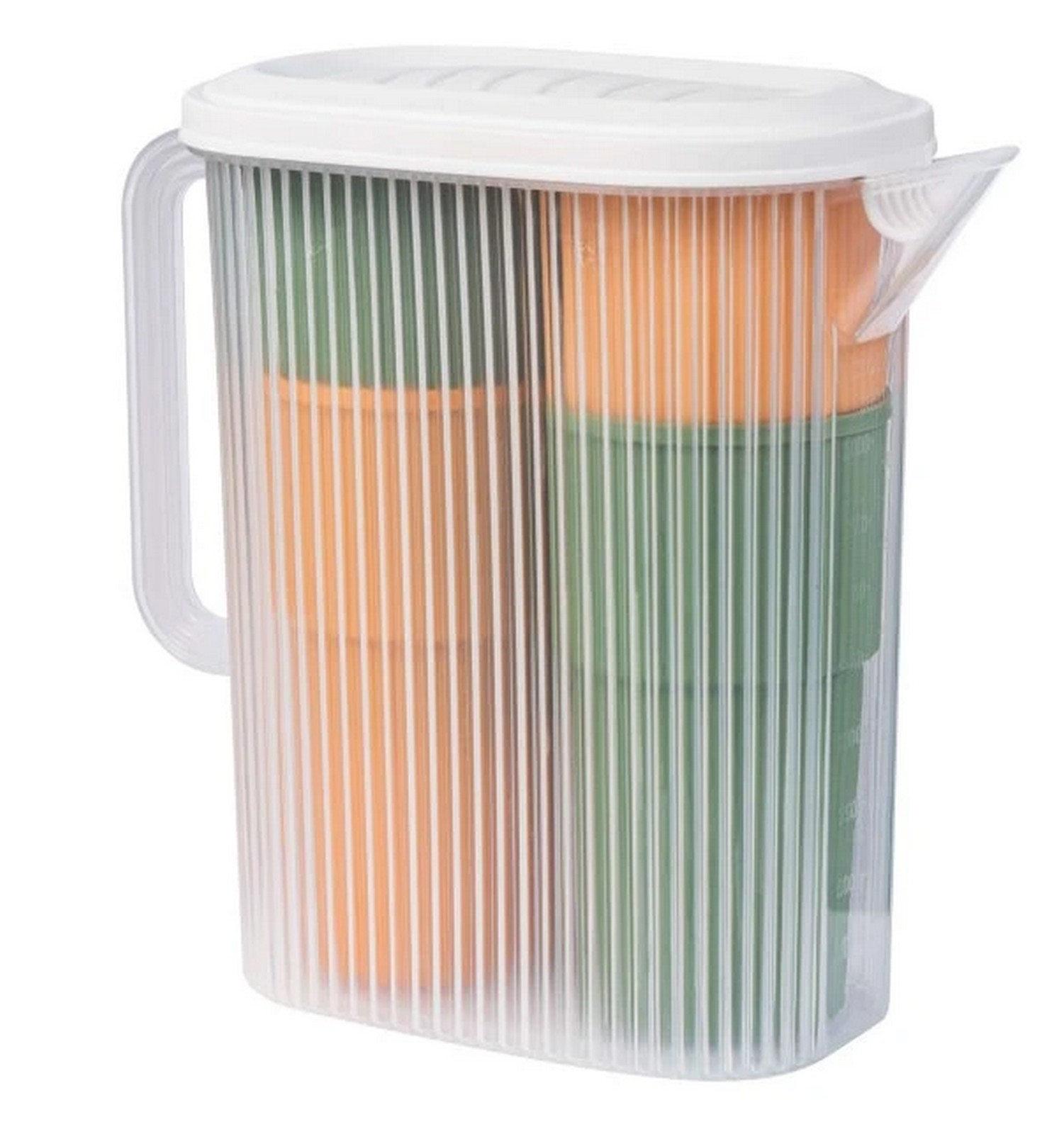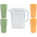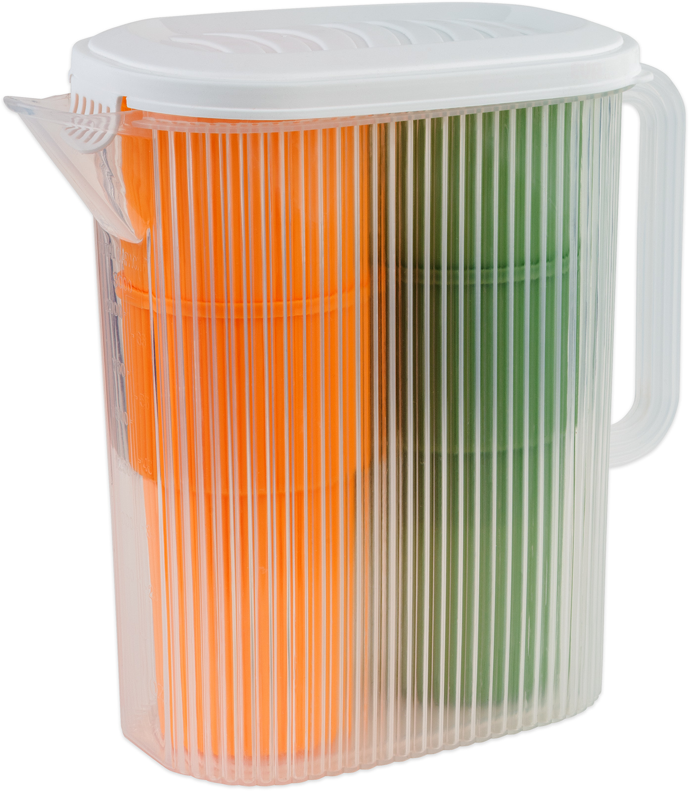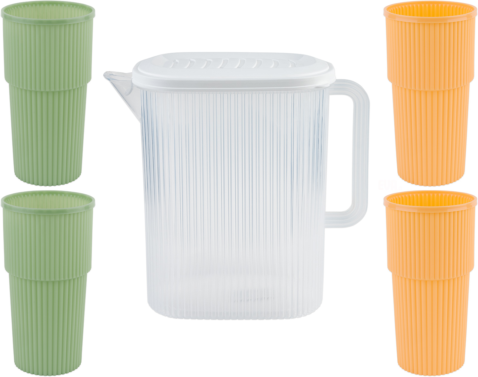 Plastový džbán s víkem. Objemu 3 l je vhodný pro koždodenní stolování i zahradní párty, vhodný do myčky na nádobí, výška 23 cm, šířka včetně ucha 24,5 cm. Součástí balení 4 kelímky (2x oranžový + 2x zelený). Džbán i kelímky možno mýt v myčce nádobí. Barva džbánu transparentní s b celý popisílým víčkem.