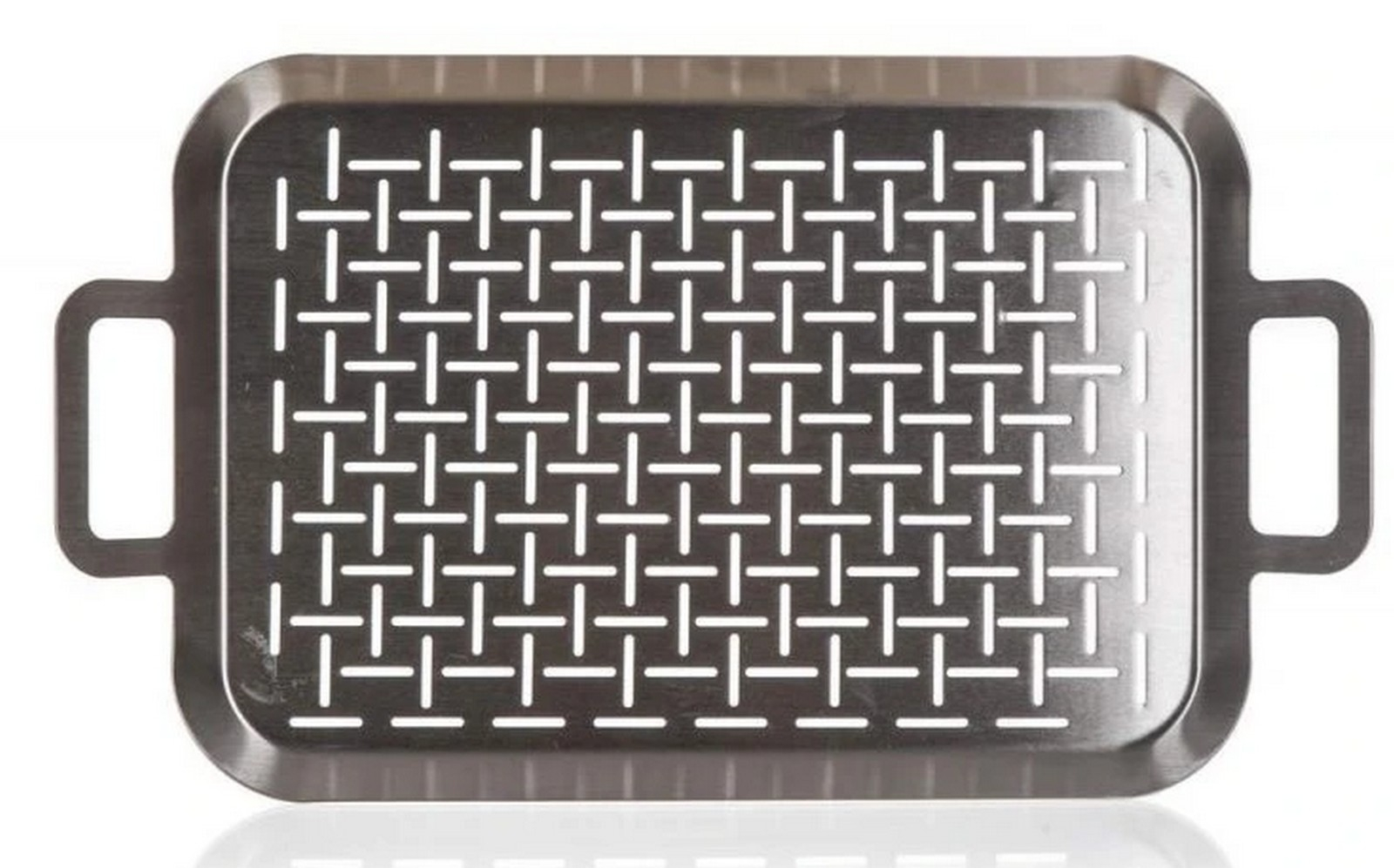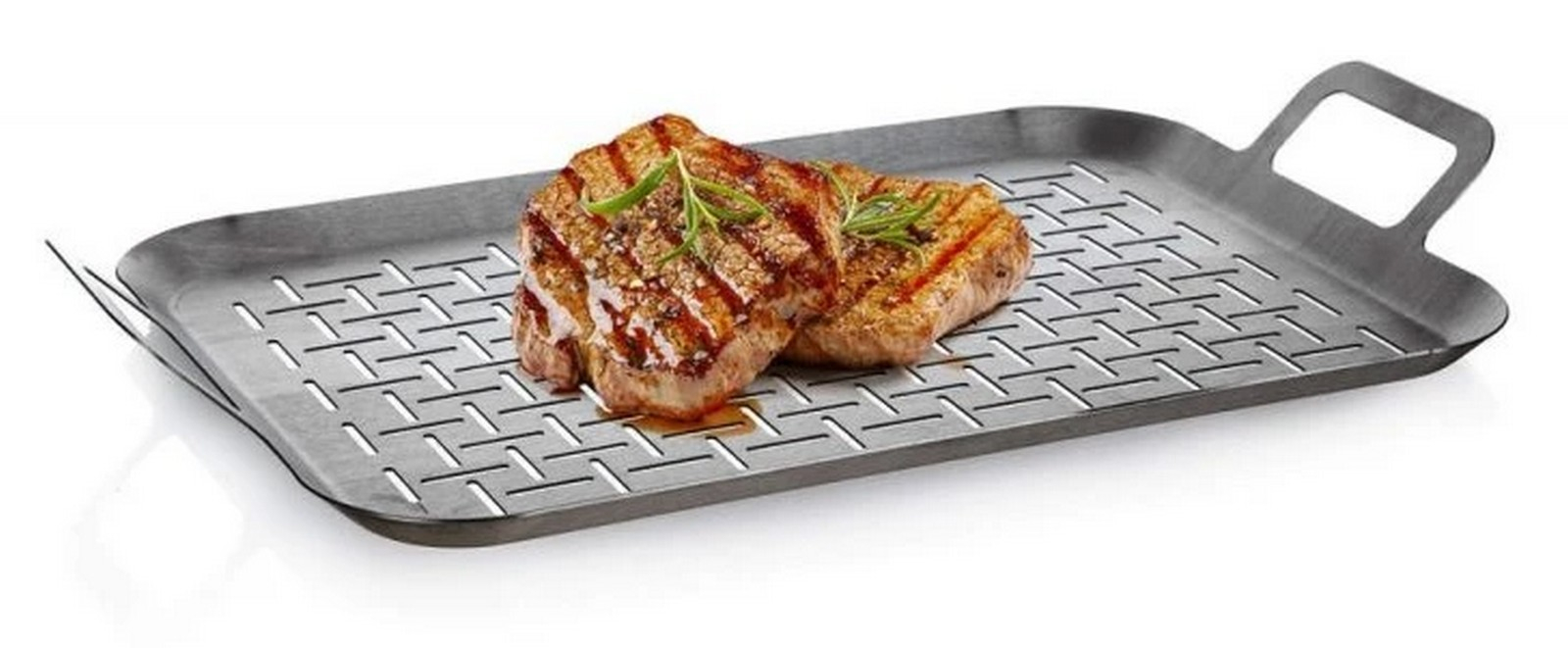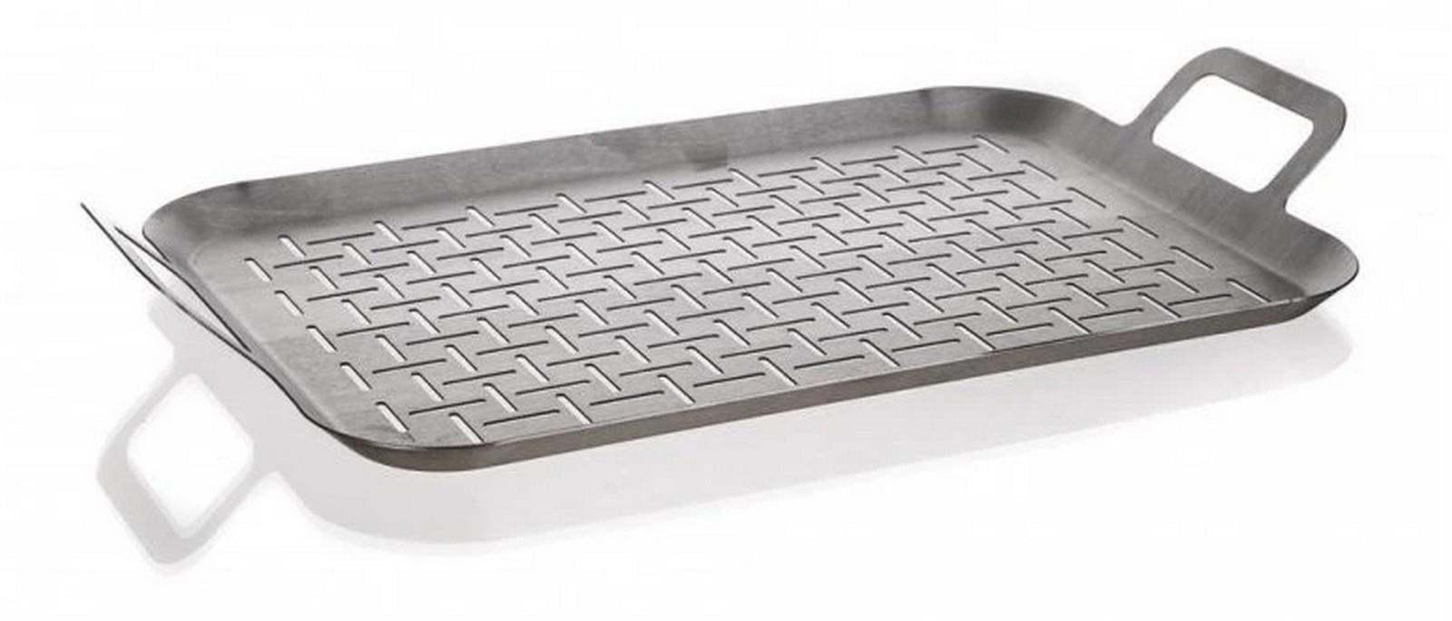 Nerezový pečící plech s uchy je ideální pro grilování drobných kousků masa či zeleniny. Zachycuje šťávu a omezuje nechtěné vzplanutí odkapávajícího tuku a šťávy. Rozměr: 43,5 x 25,5 x 5 cm.