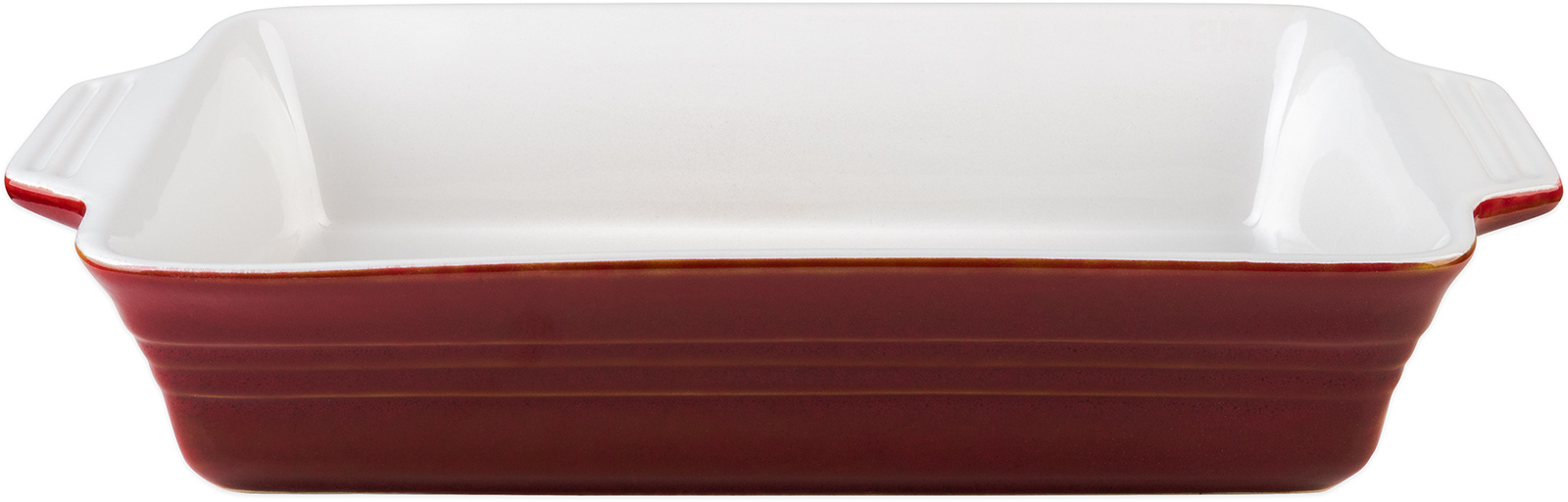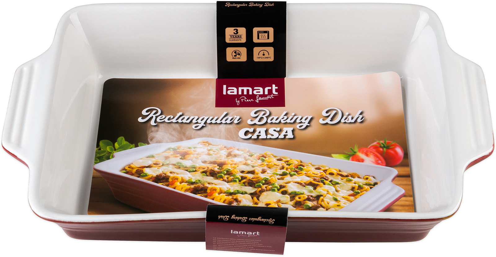 Keramická obdélníková zapékací forma, rovnoměrně absorbuje teplo a postupně ho uvolňuje, díky čemuž se pokrmy dobře propečou, odolává teplotám - 18 až 240°C, rozměry : 38,7 x 22,5, x 7 cm, objem 2,5 l. Drobné nerovnosti a praskliny jsou charakteristickou vlastností materiálu a ne celý popisjsou důvodem k reklamaci, snadná údržba a čištění pod tekoucí vodou nebo v myčce nádobí. Barva červená/bílá.