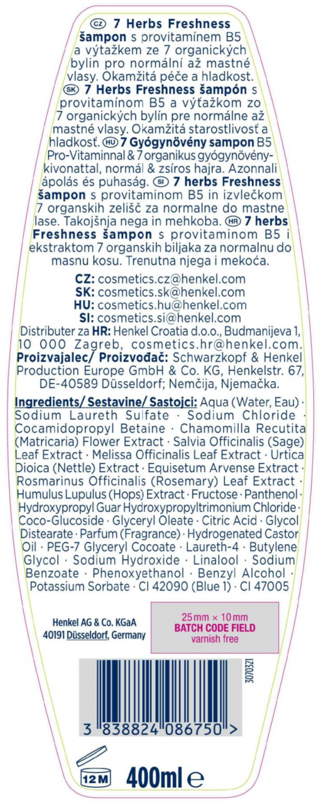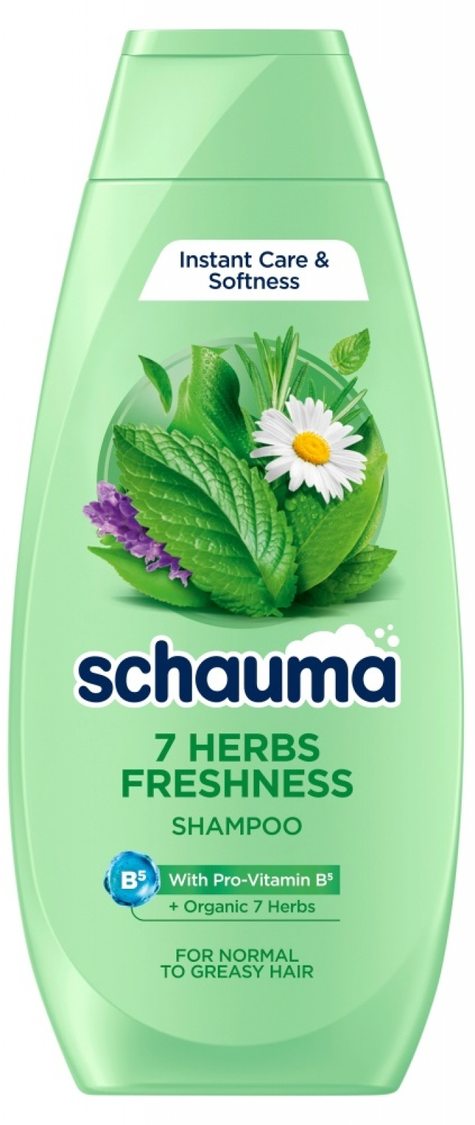 Šampon SCHAUMA 7 Herbs Freshness s provitamínem B5 a výtažky ze 7 bylin pro normální až mastné vlasy. Okamžitá péče a hladkost.