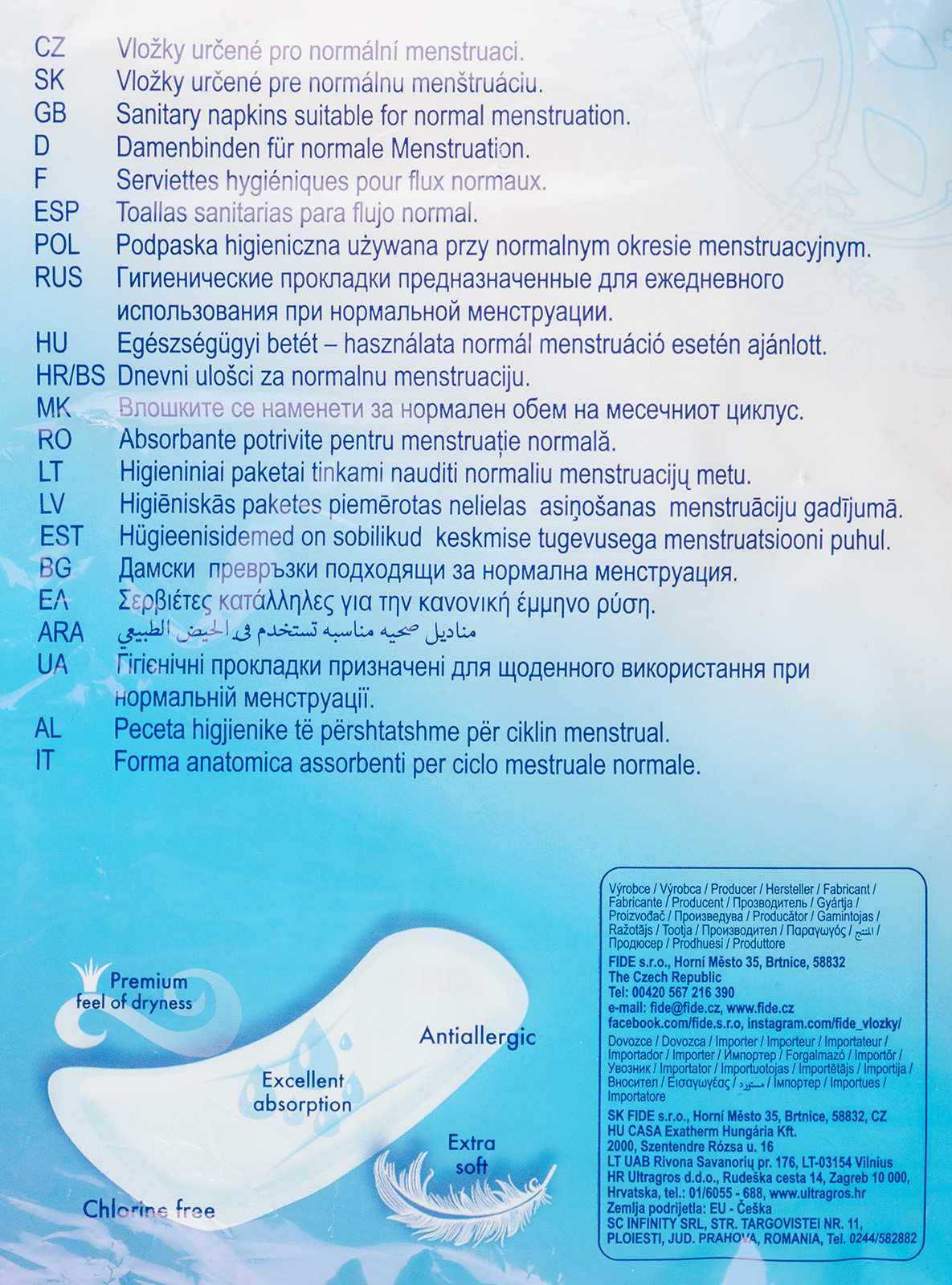 Vložky moderní konstrukce anatomicky tvarované s vysokou absorpční schopností. Široké nalepovací pruhy dokonale fixují vložku. Vhodné pro všechny spotřebitelky.