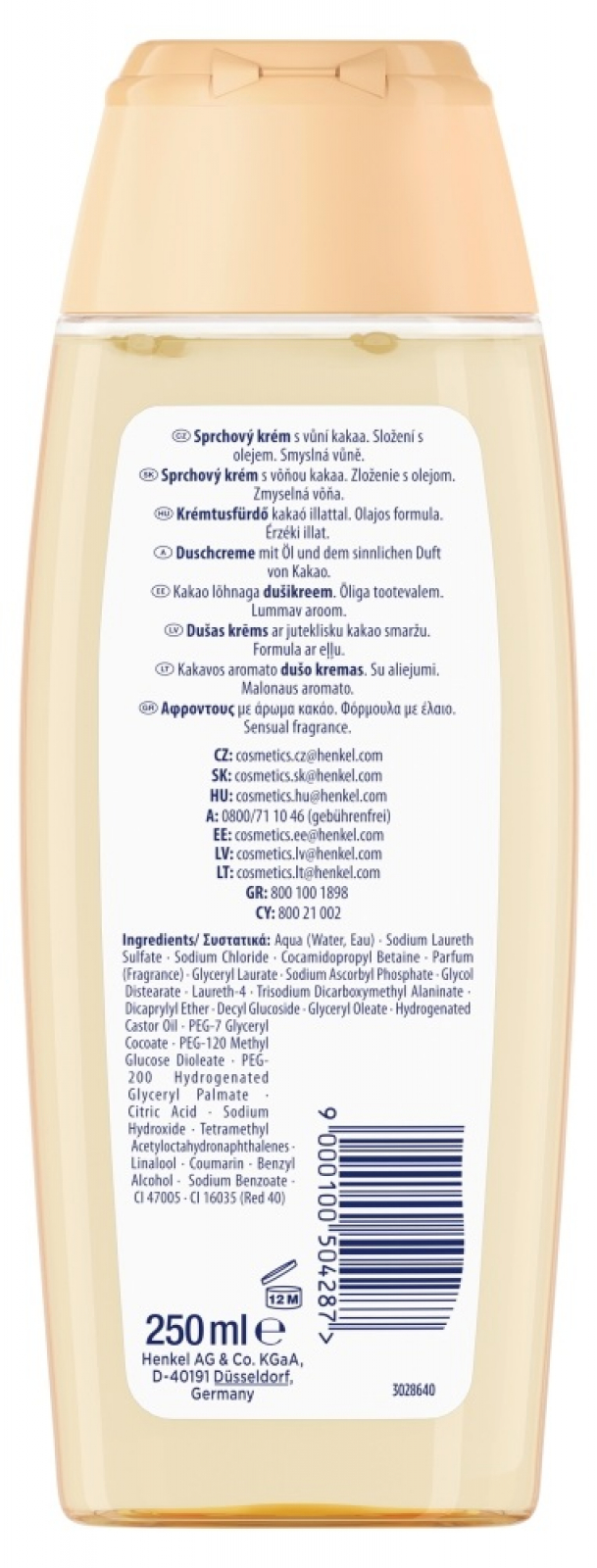 Sprchový krém s vůní kakaa. Složení s olejem. Smyslná vůně.