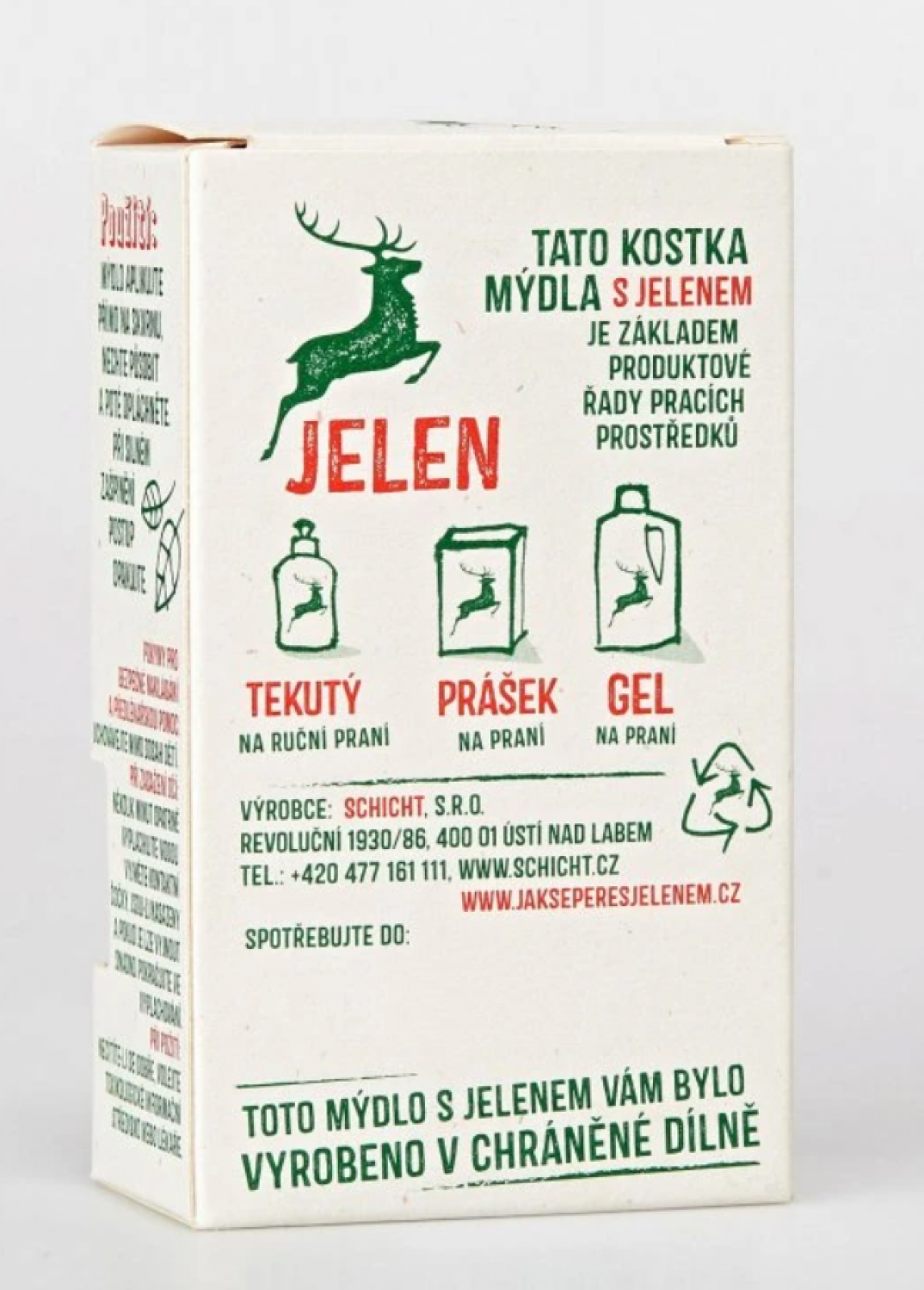 Šetrný k přírodě i pokožce, obsahuje více jak 68 % nebarveného mýdla. Opravdové jádrové mýdlo používaly už naše babičky, jeho účinnost ovšem potvrzují i nové nezávislé testy. Praní s Jelenem je přitom hračka: prádlo namočíte, potřete mýdlem a ručně promnete.