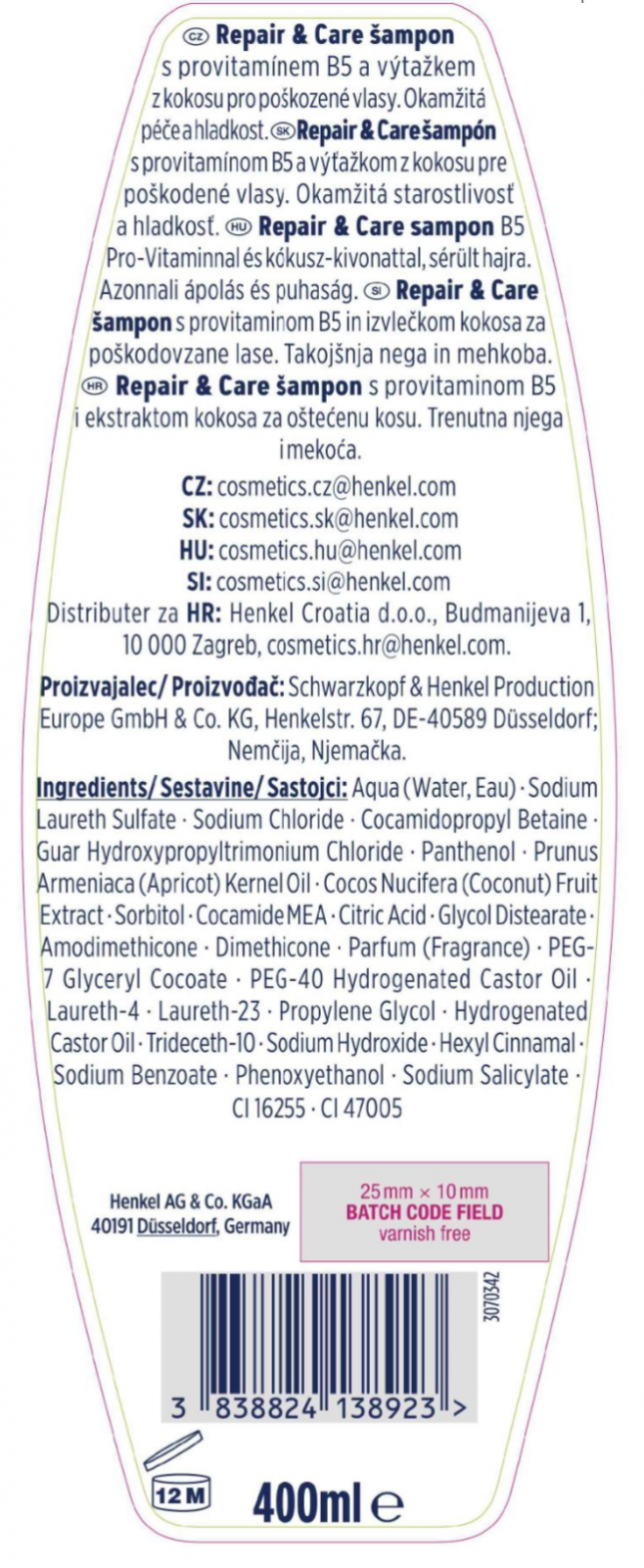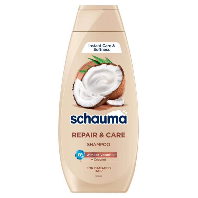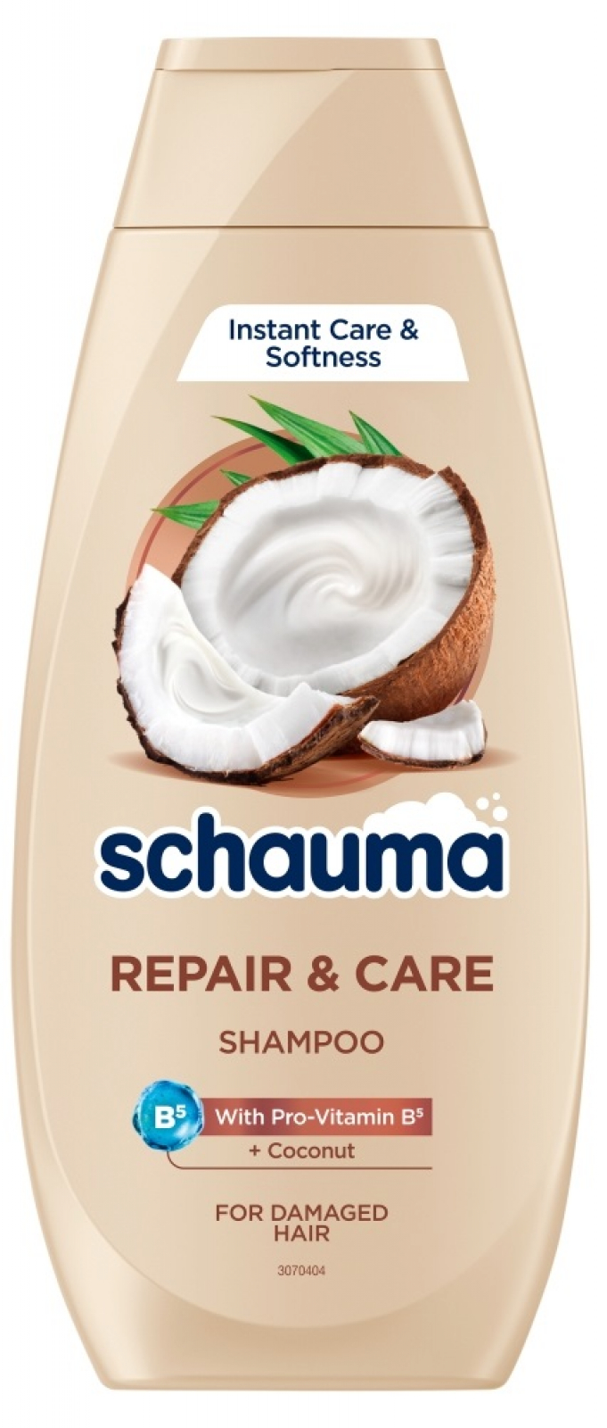 Šampon SCHAUMA Repair & Care s provitamínem B5 a výtažkem z kokosu pro poškozené vlasy. Okamžitá péče a hladkost.