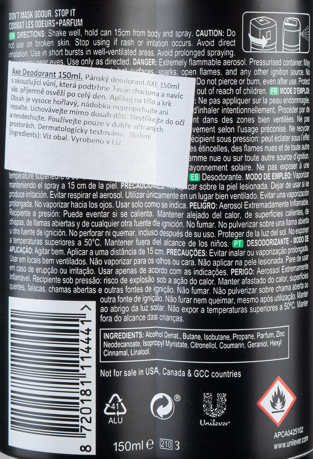 Složení: Alcohol denat., Butane, Isobutane, Propane, Parfum, Citronellol, Coumarin, Geraniol, Hexyl cinnamal, Linalool