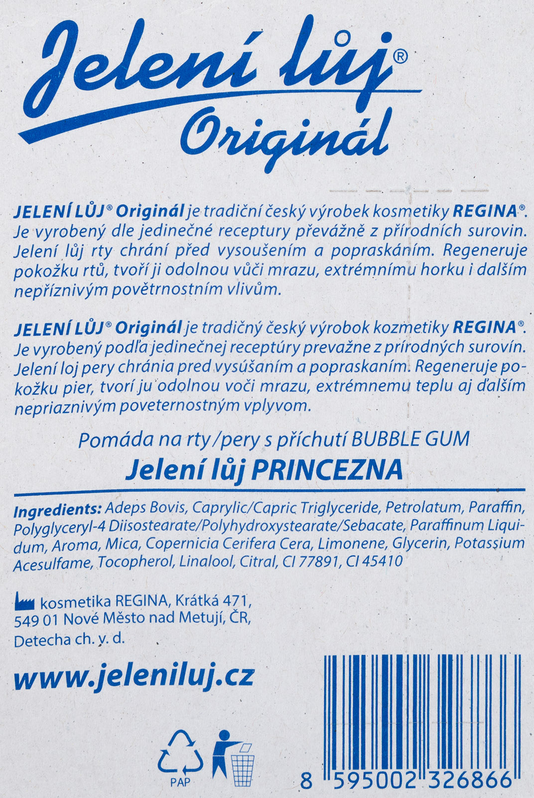 Jelení lůj určený k péči a ochraně rtů, tradiční pomáda na rty pro holčičky a teenagery „princezny". Lehce tónuje a krásně voní jako Bubble gum (žvýkačkové aroma).