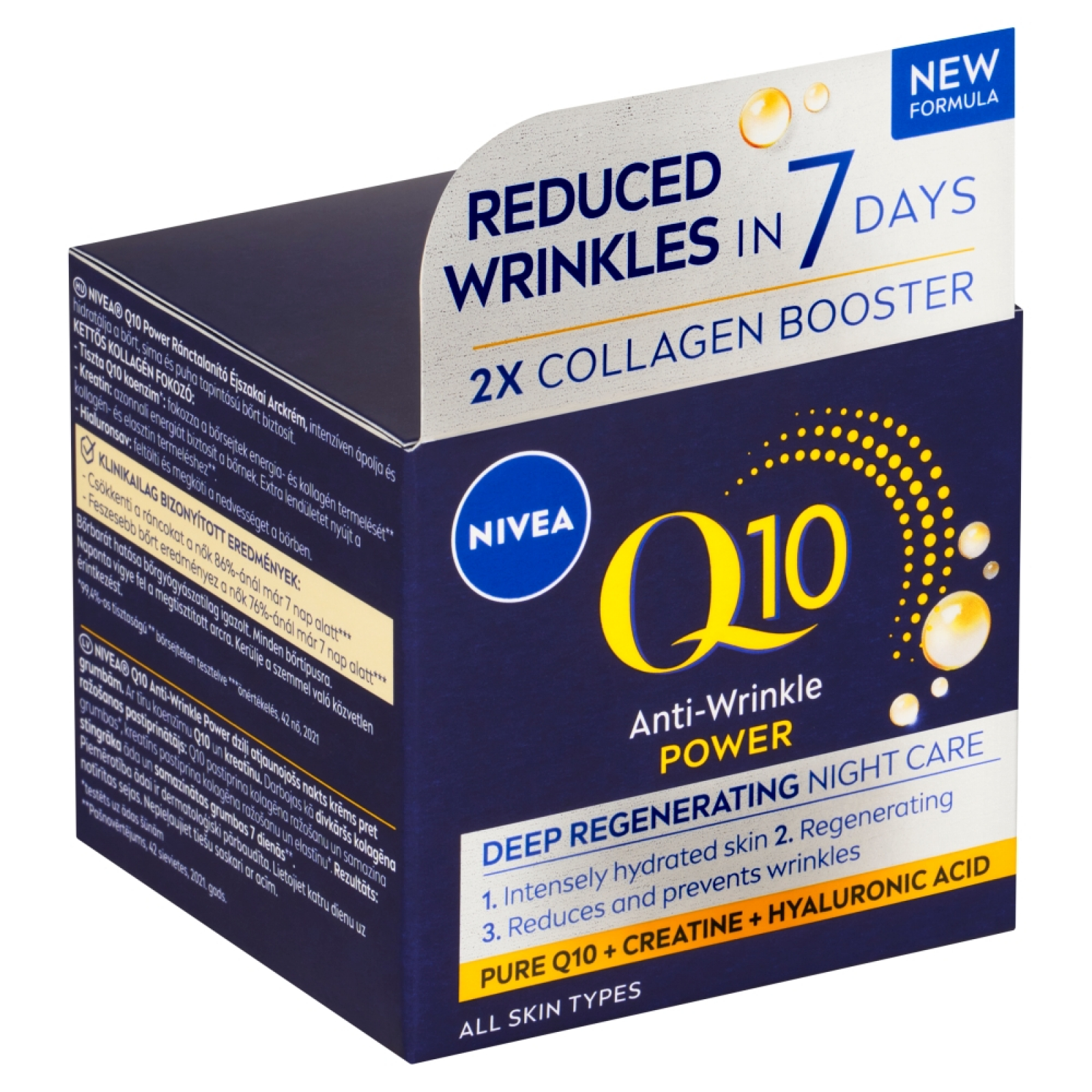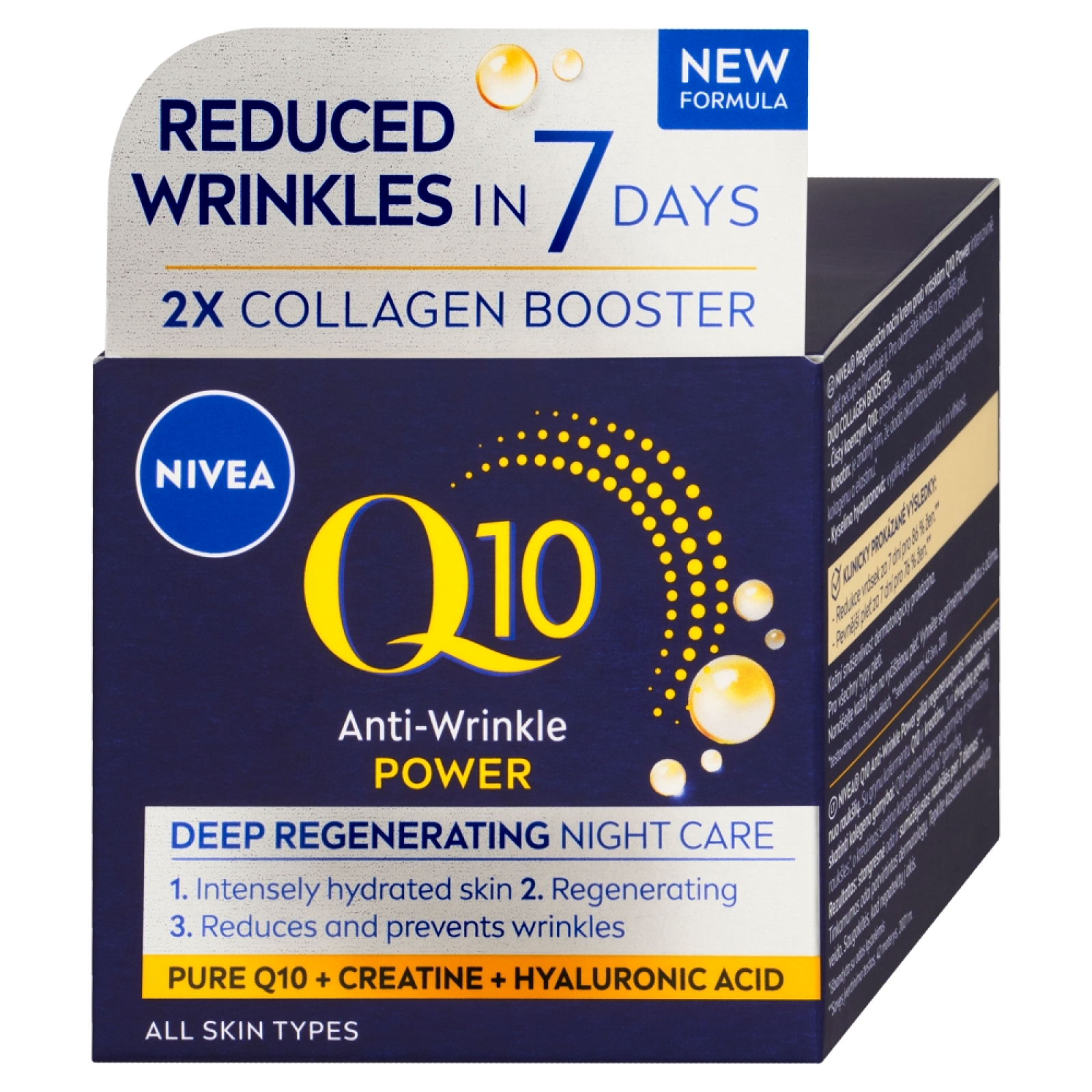 Regenerační noční krém proti vráskám Q10 Power intenzivně o pleť pečuje a hydratuje ji. Pro okamžitě hladší a jemnější pleť. Čistý koenzym Q10: posiluje kožní buňky a zvyšuje tvorbu kolagenu. Kreatin: je známý tím, že dodá okamžitou energii. Podporuje tvorbu kolagenu a elastinu. celý popisKyselina hyaluronová: vyplňuje pleť a uzamyká v ní vlhkost. U tohoto výrobku dochází ke změně designu, může Vám být dodán výrobek s odlišným obalem.