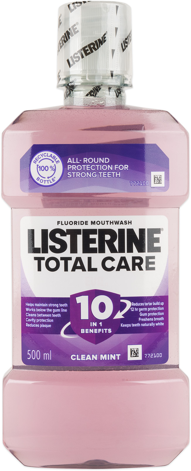 Listerine® Total Care čistí a chrání pro celkové zdraví ústní dutiny pomocí 6 výhod: Omezuje zubní povlak, Udržuje zdravé dásně, Posiluje zuby proti zubnímu kazu, Brání tvorbě zubního kamene a pomáhá tak udržovat zuby přirozeně bílé, Ničí bakterie v mezizubním prostoru, Udržuje s celý popisvěží dech až po 24 hodin. Přípravek je obzvláště účinný při používání ráno a večer po vyčištění zubů. Odměřte 20 ml (4 x 5 ml - 4 plné čajové lžičky) do skleničky, proplachujte prostor kolem zubů a dásní po 30 vteřin a poté vyplivněte.