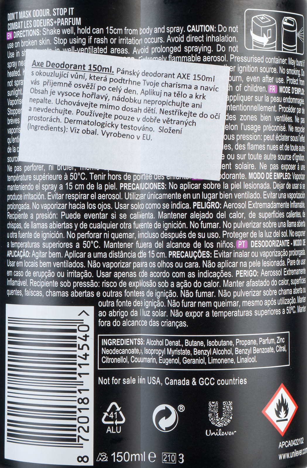 Bezpečnostní pokyny: Nebezpečí. Extrémně hořlavý aerosol. UPOZORNĚNÍ: Před použitím protřepat. Aplikujte přímo na pokožku ze vzdálenosti 15 cm. Vyvarujte se přímému vdechování. Používejte pouze v krátkých dávkách v dobře větraných prostorách, vyvarujte se dlouhotrvající aplikace. Nepoužívejte na jiné než určené účely. Nestříkejte v blízkosti očí. Nepoužívejte na poškozenou pokožku. V případě zarudnutí nebo podráždění přestaňte používat. Uchovávejte mimo dosah dětí. Nádoba je pod tlakem: při zahřívání se může roztrhnout. Nepropichujte nebo nespalujte ani po použití. Chraňte před slunečním zářením. Nevystavujte teplotě přesahující 50°C. Nestříkejte do otevřeného ohně nebo jiných zdrojů zapálení. Chraňte před teplem, horkými povrchy, jiskrami, otevřeným ohněm a jinými zdroji zapálení. Zákaz kouření.