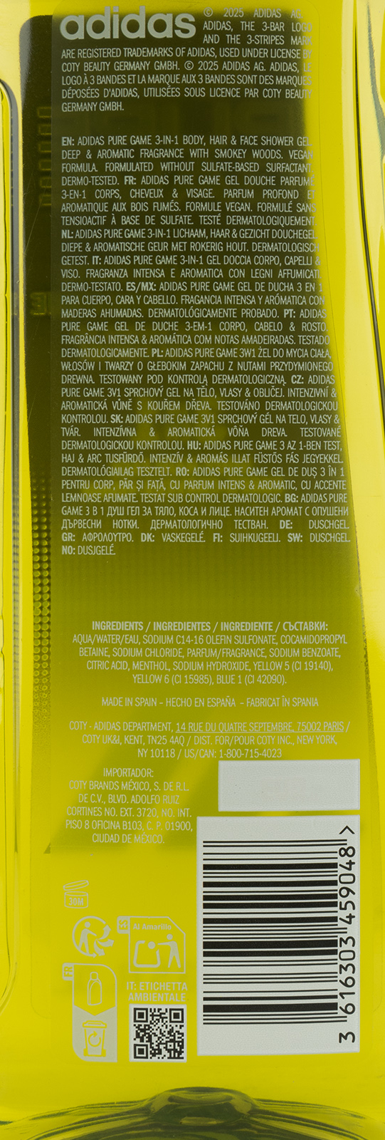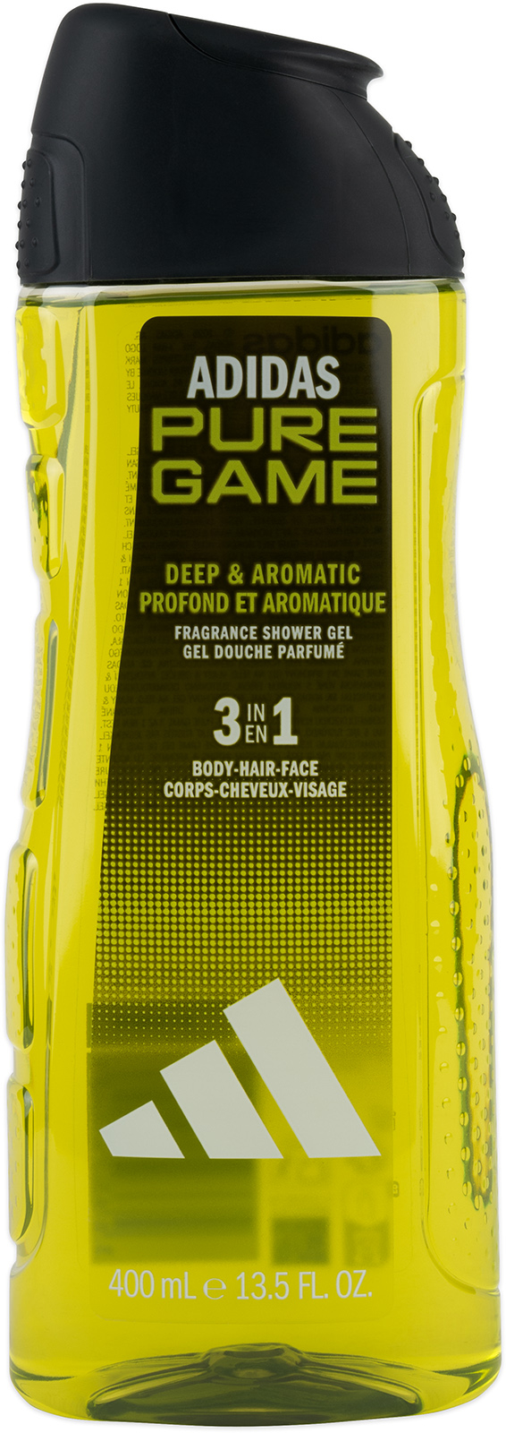 Pánský sprchový gel 3v1 Adidas Pure Game 400 ml, na tělo, tvář a vlasy, obohacený o guajakové dřevo, intenzivní dřevitá vůně uvolní vaše tělo po každodenní námaze.