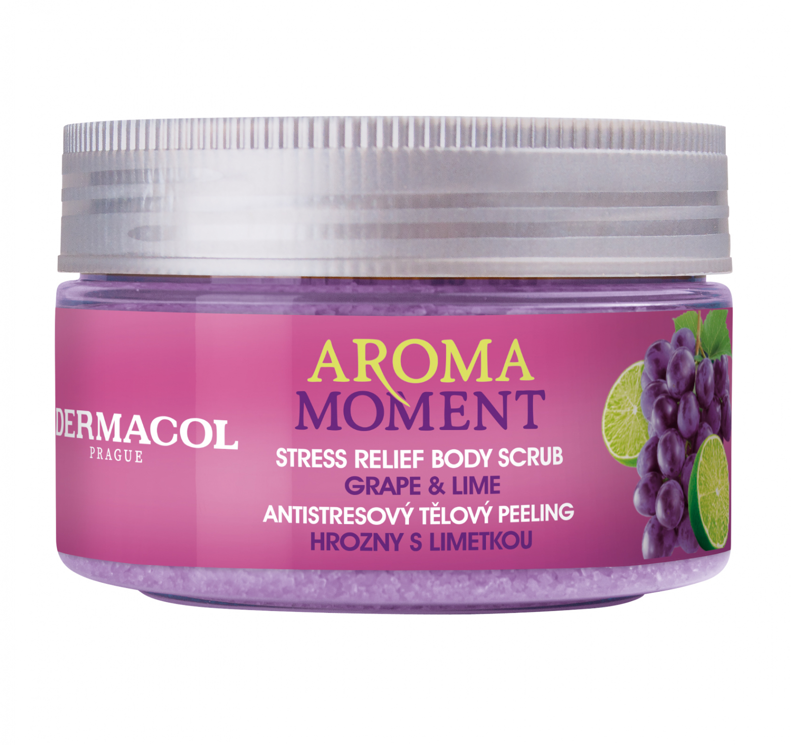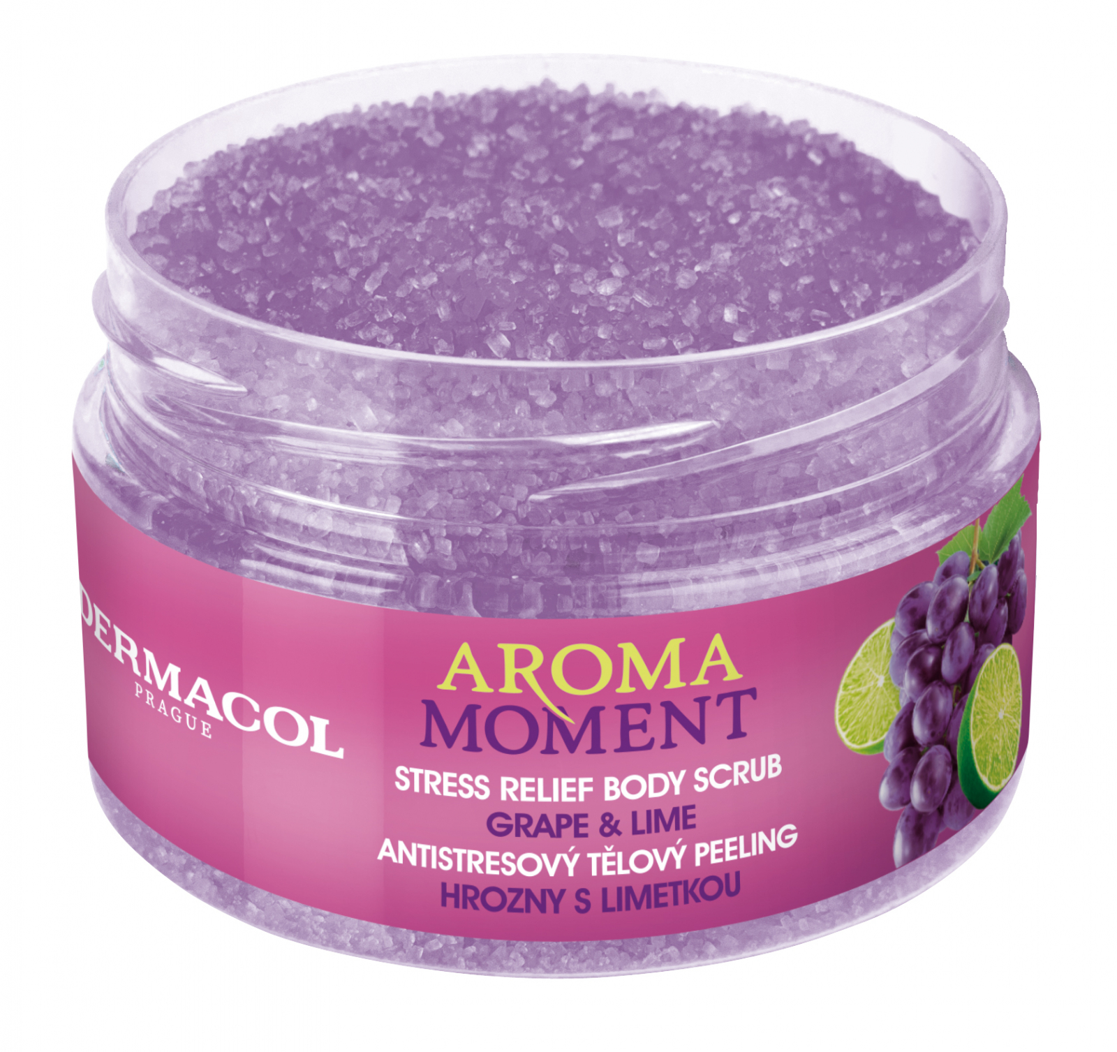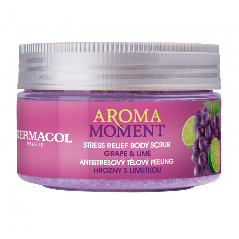 Antistresový tělový peeling s vůní hroznů s limetkou, jemný tělový peeling šetrně odstraňuje odumřelé kožní buňky prostřednictvím krystalků cukru, čistí a vyhlazuje pokožku těla a navrací jí tak vitalitu, olej z hroznových jadérek podporuje regeneraci pokožky a zpomaluje její stá celý popisrnutí, vůně hroznů s limetkou uvolňuje nahromaděný stres po náročném dni a uklidňuje mysl.