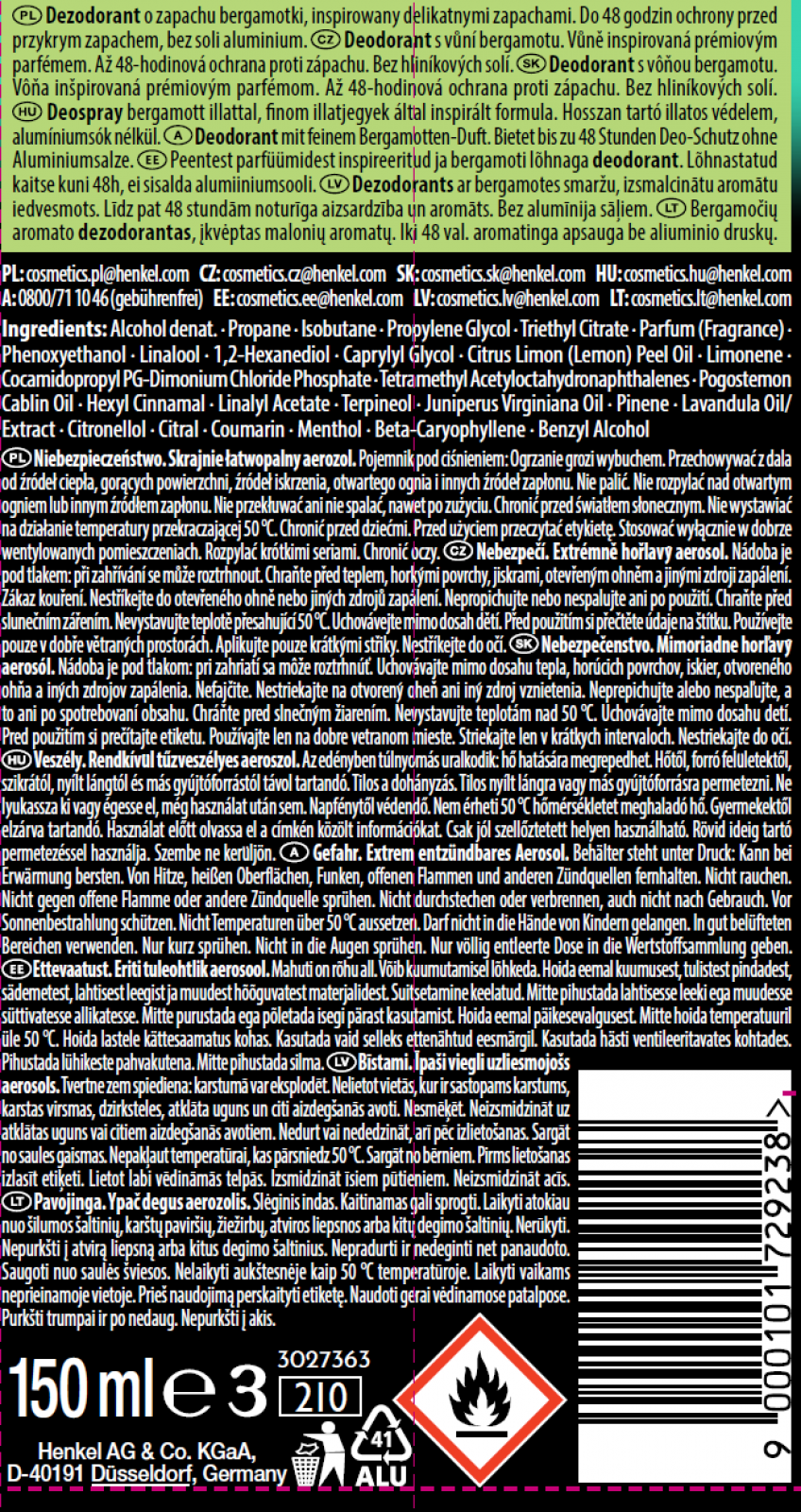 Bezpečnostní varování: Extrémně hořlavý aerosol. Nebezpečí. Nádoba je pod tlakem: při zahřívání se může roztrhnout. Chraňte před teplem, horkými povrchy, jiskrami, otevřeným ohněm a jinými zdroji zapálení. Zákaz kouření. Nestříkejte do otevřeného ohně nebo jiných zdrojů zapálení. Nepropichujte nebo nespalujte ani po použití. Chraňte před slunečním zářením. Nevystavujte teplotě přesahující 50°C. Uchovávejte mimo dosah dětí. Před použitím si přečtěte údaje na štítku. Používejte pouze v dobře větraných prostorách. Aplikujte pouze krátkými střiky. Nestříkejte do očí. Nepoužívejte na podrážděnou nebo poškozenou kůži. Nevdechujte.