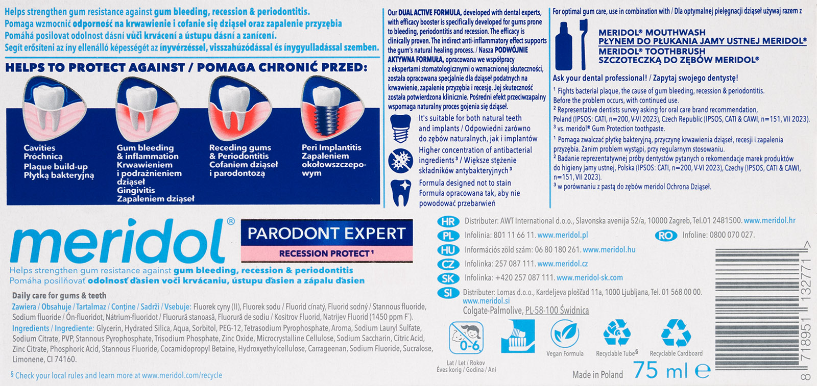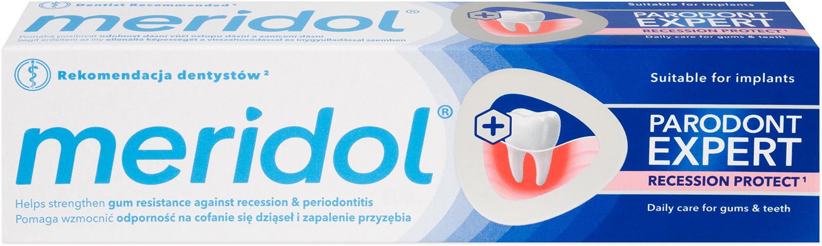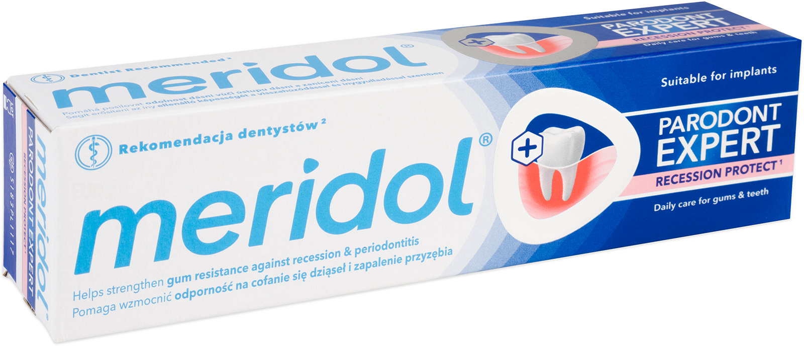 Zubní pasta Meridol Paradont Expert je dobrou volbou pro lidi s podrážděnými dásněmi. Oproti zubní pastě Meridol obsahuje Meridol Paradont Expert vyšší koncentraci antibakteriálních složek, které mají protizánětlivý účinek důležitý pro podporu přirozeného hojení dásní. Dvojí aktivní složení zubní pasty bylo navrženo speciálně pro dásně, které jsou náchylné ke krvácení a parodontitidě.