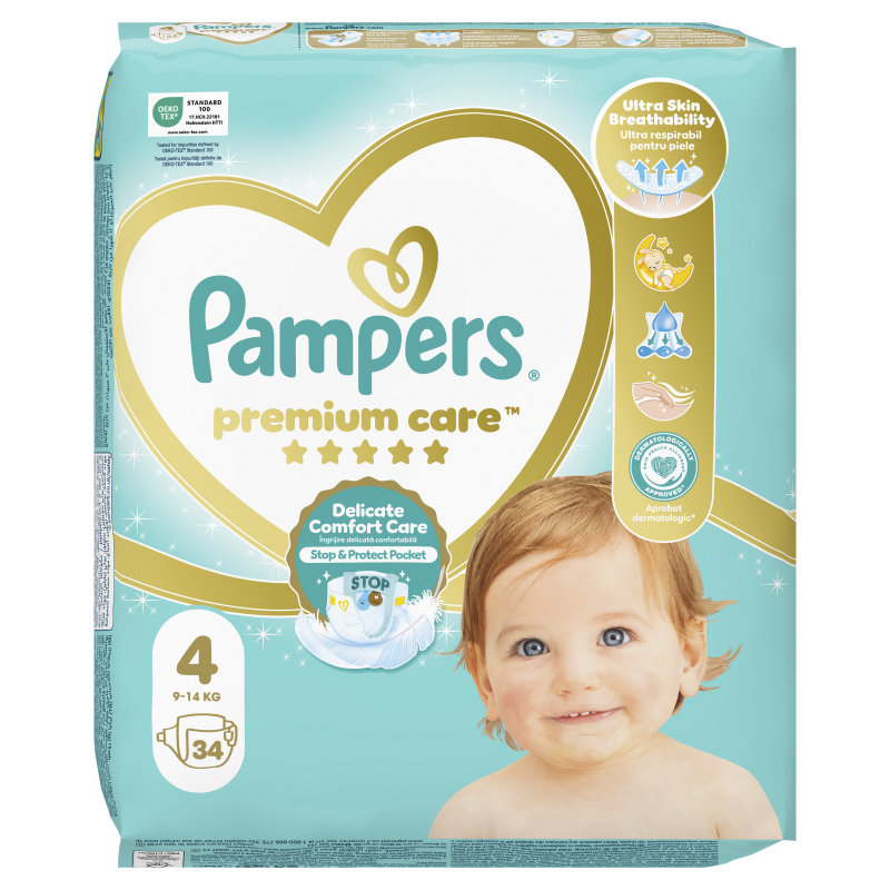 Pokožka vašeho dítěte bude cítit jenom lásku od prvního doteku s plenkami Pampers Premium Care, nejlepší ochranou pokožky. Hedvábně hebké a okamžitě suché. Plenky byly speciálně navržené pro pokožku vašeho novorozence, s hedvábně hebkou povrchovou vrstvou a 3 absorpčními kanálky, celý popis které rychle absorbují vlhkost pro okamžitý pocit sucha. Aby mohla pokožka dýchat, jsou plenky vyrobené z prodyšných materiálů, které propouští čerstvý vzduch dovnitř a vlhký vzduch ven. Plenka má také indikátor vlhkosti, který změní barvu vždy, když je třeba plenku vyměnit. Tvar přizpůsobený pupíku děťátka je zase speciálně navržen pro ochranu citlivého bříška vašeho dítěte. Určeno pro děti o váze 9-14 kg, 34 ks v balení.