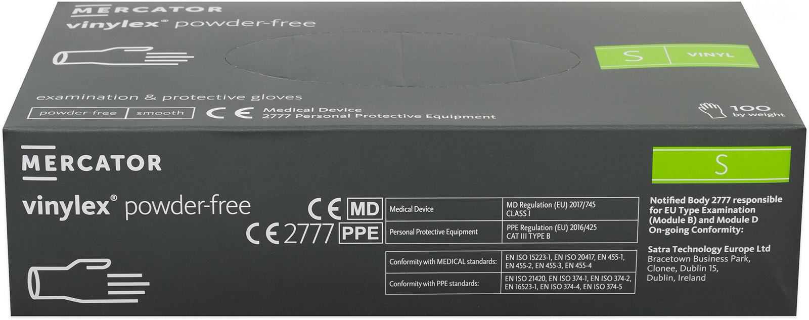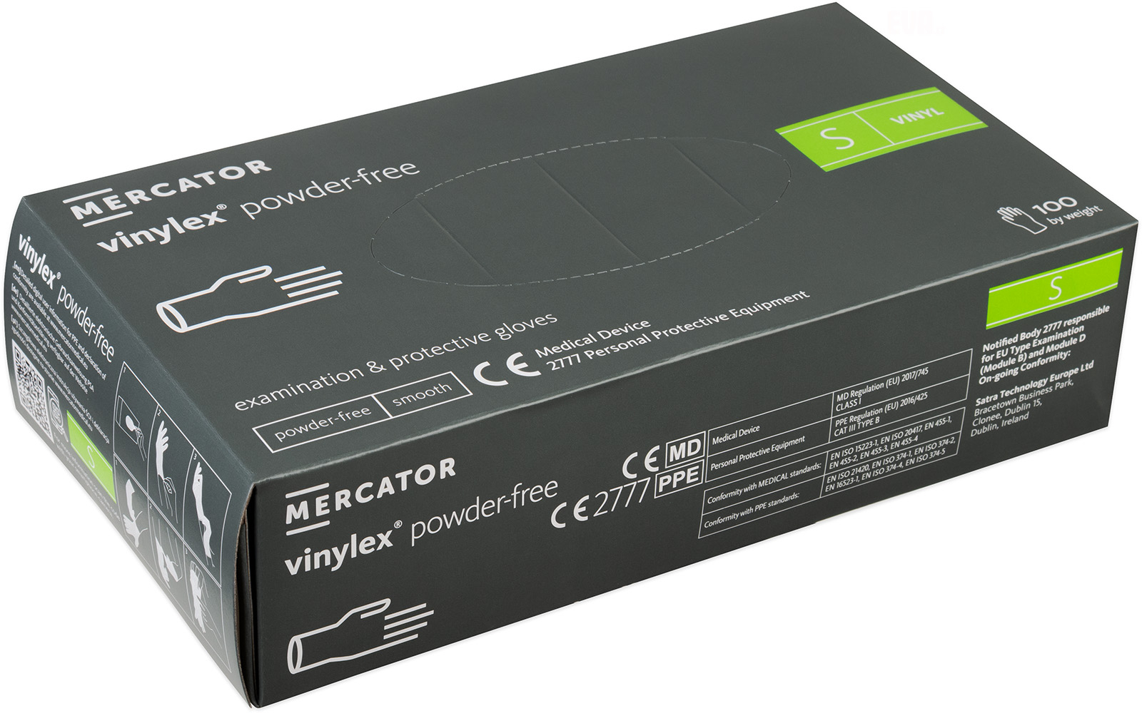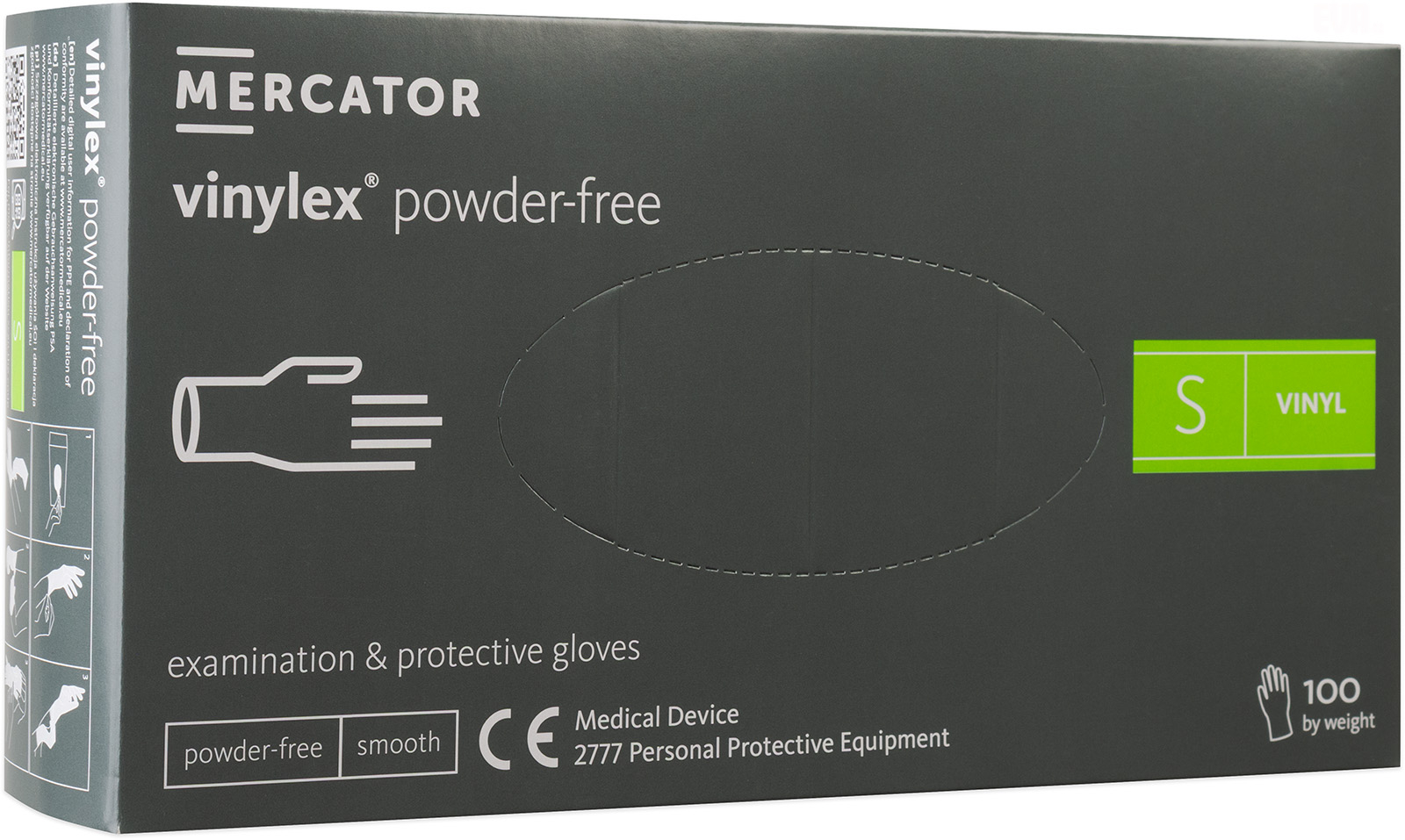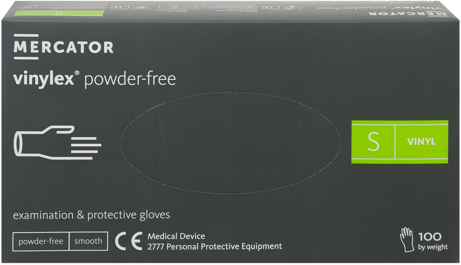 Kvalitní vinylové ochranné rukavice bez latexu určené nejen pro profesionály, vhodné pro osoby alergické na latex nebo s citlivou kůží, bez pudrového prostředku pro usnadnění navlékání i na vlhké ruce. Texturovaný povrch zajišťuje pevný úchop a mimořádnou dotykovou citlivost. Bal celý popisení 100 ks, velikost S, délka rukavice 240 mm, pro šířku dlaně 70-90 mm.