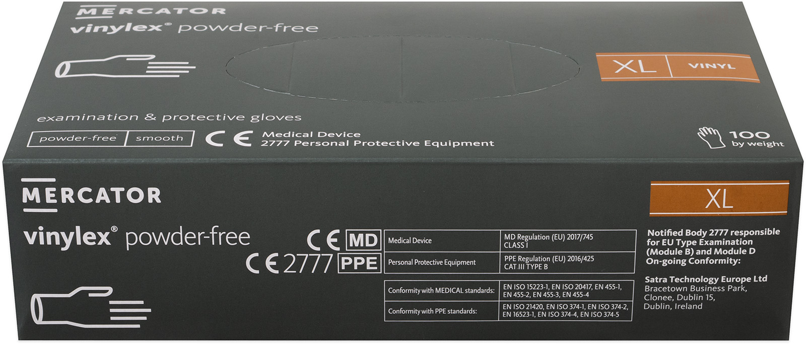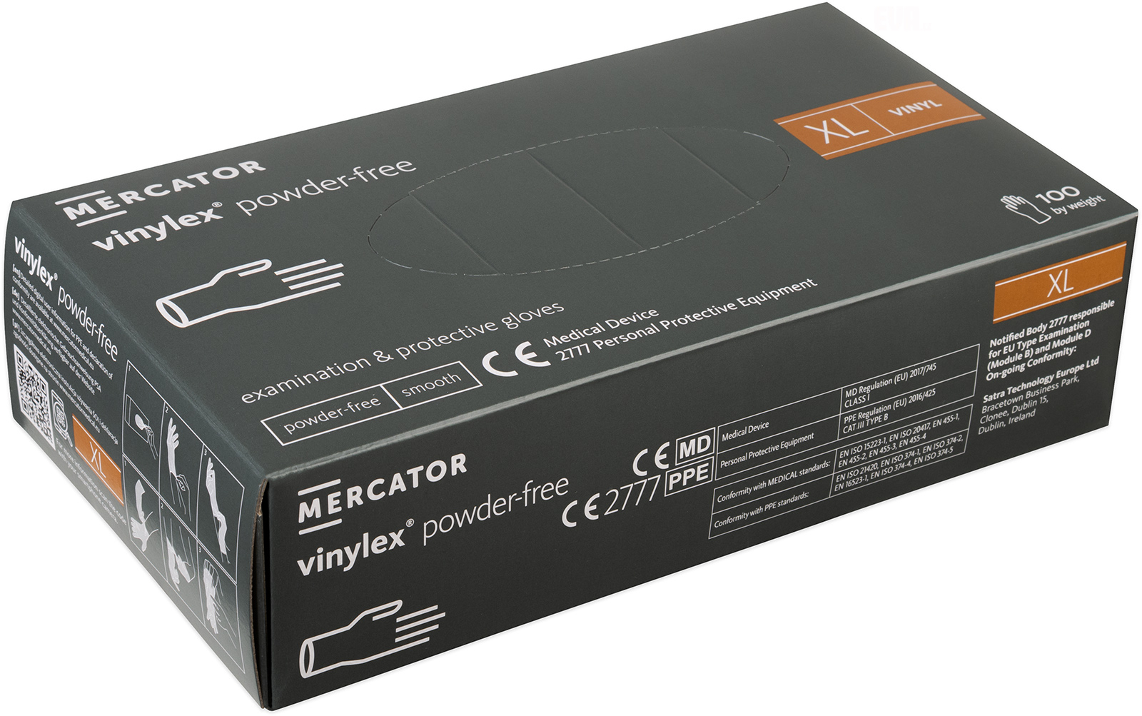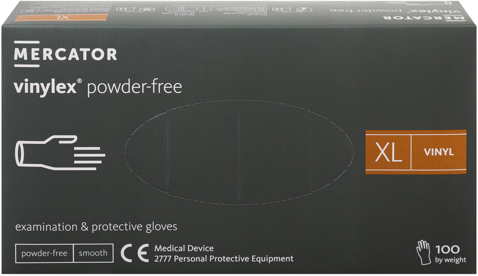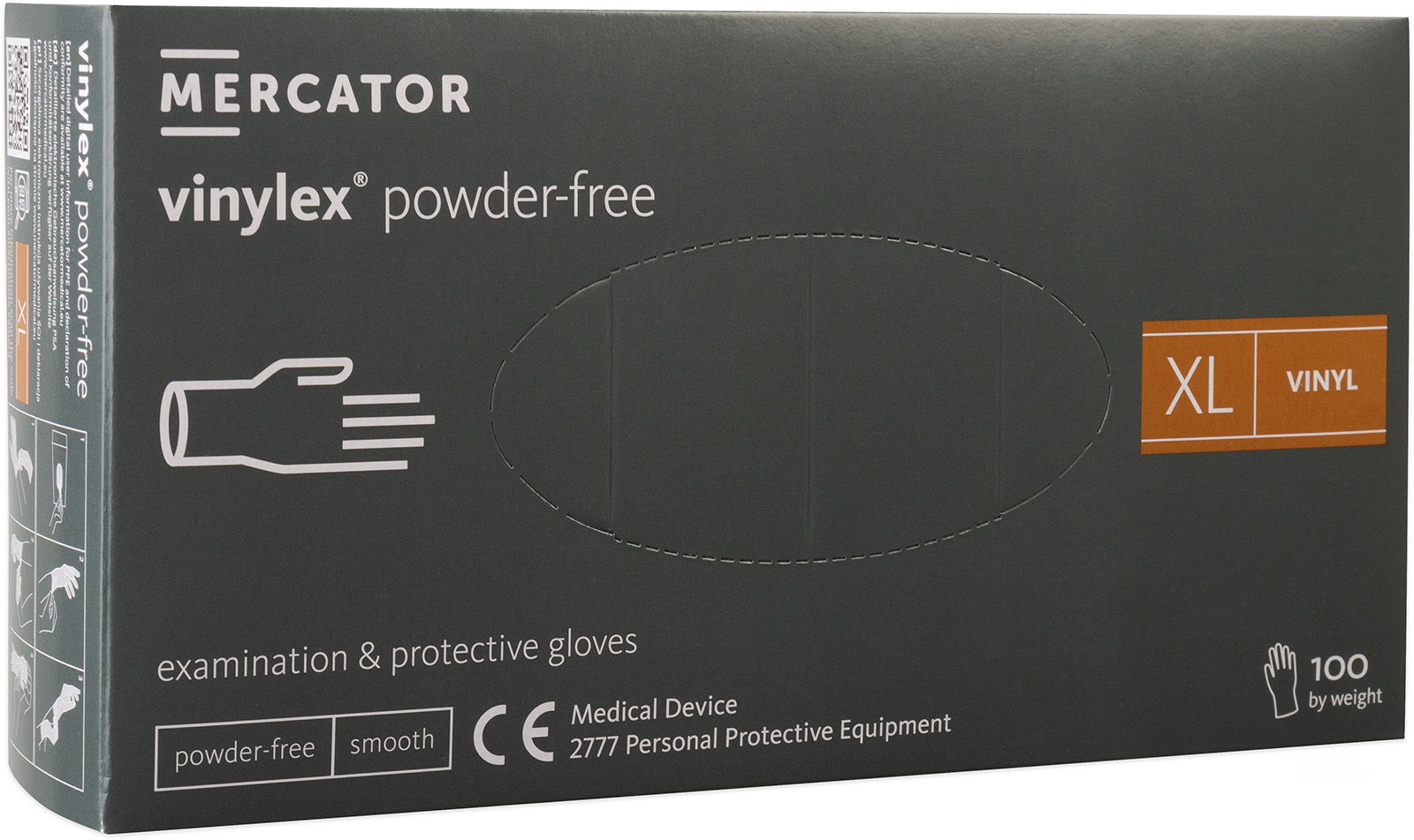 Kvalitní vinylové ochranné rukavice bez latexu určené nejen pro profesionály, vhodné pro osoby alergické na latex nebo s citlivou kůží, bez pudrového prostředku pro usnadnění navlékání i na vlhké ruce. Texturovaný povrch zajišťuje pevný úchop a mimořádnou dotykovou citlivost. Bal celý popisení 100 ks, velikost XL, délka rukavice 240 mm, pro dlaně širší než 110 mm.