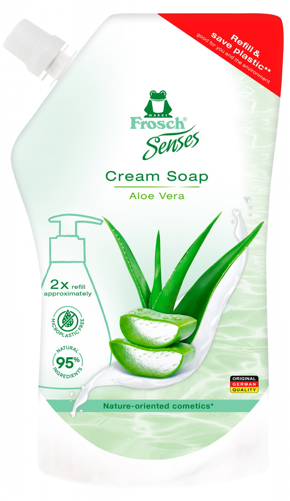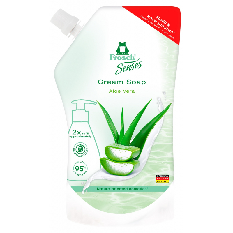 Ekologická a ekonomická náplň tekutého mýdla s jemnou recepturou a pečujícími výtažky z aloe vera čistí pokožku a ochraňuje ji před vysycháním. Cenné přísady podporují zachování přirozené kyselosti pokožky a zanechávají po použití příjemně čistý a hebký pocit.