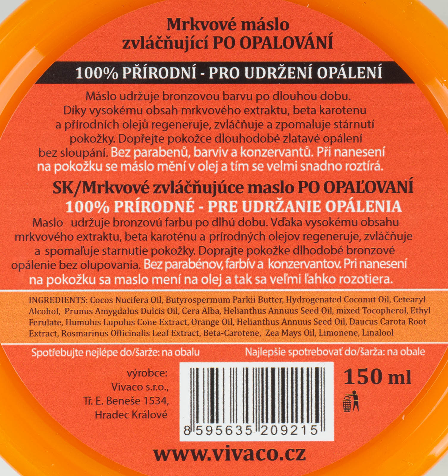 100% přírodní mrkvové máslo zvláčňuje, regeneruje a udržuje bronzovou barvu po dlouhou dobu. Díky vysokému obsahu mrkvového extraktu, beta karotenu a přírodních olejů, regeneruje, zvláčňuje a zpomaluje stárnutí pokožky. Dopřejte své pokožce dlouhodobé zlatavé opálení bez sloupání. Bez parabenů, barviv a konzervantů. Při nanesení na pokožku se máslo mění v olej a tím se velmi snadno roztírá.