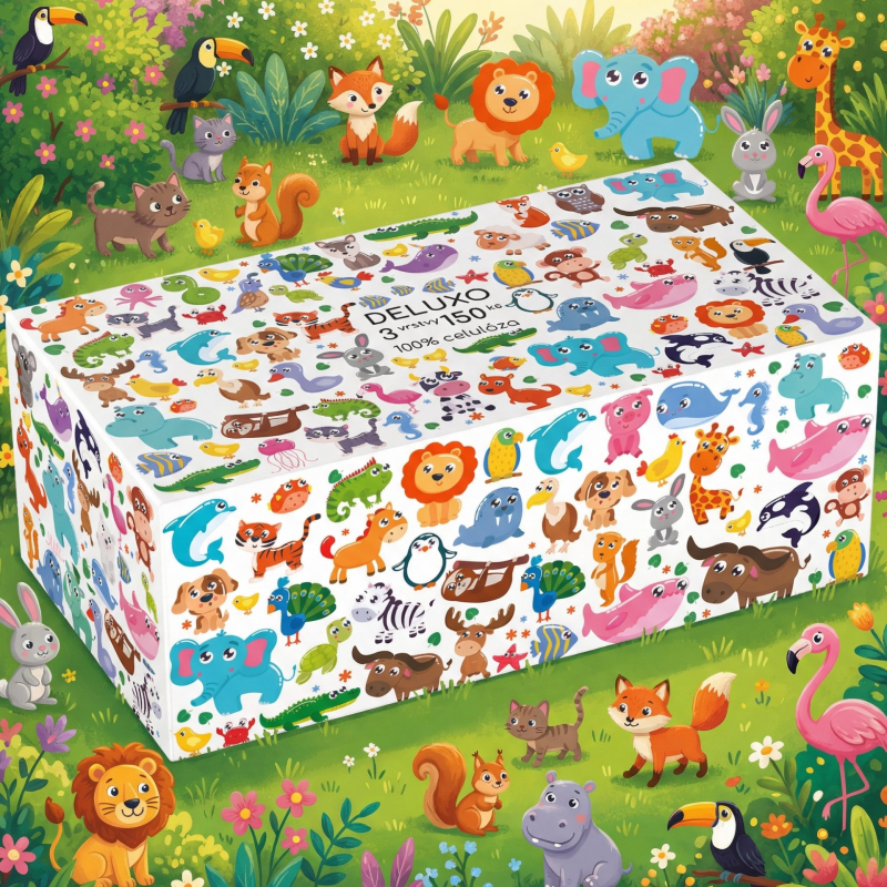 Třívrstvé papírové kapesníčky Deluxo jsou jemné, měkké a zároveň pevné, vhodné pro každodenní použití, vyrobeny ze 100% celulózy. Rozměry kapesníčku jsou 200 x 190 mm. Praktická krabička s veselým dětským motivem je ozdobou každého interiéru. Karton obsahuje 40 krabiček. Deluxo celý popisjsou papírové kapesníky, které udělají radost.