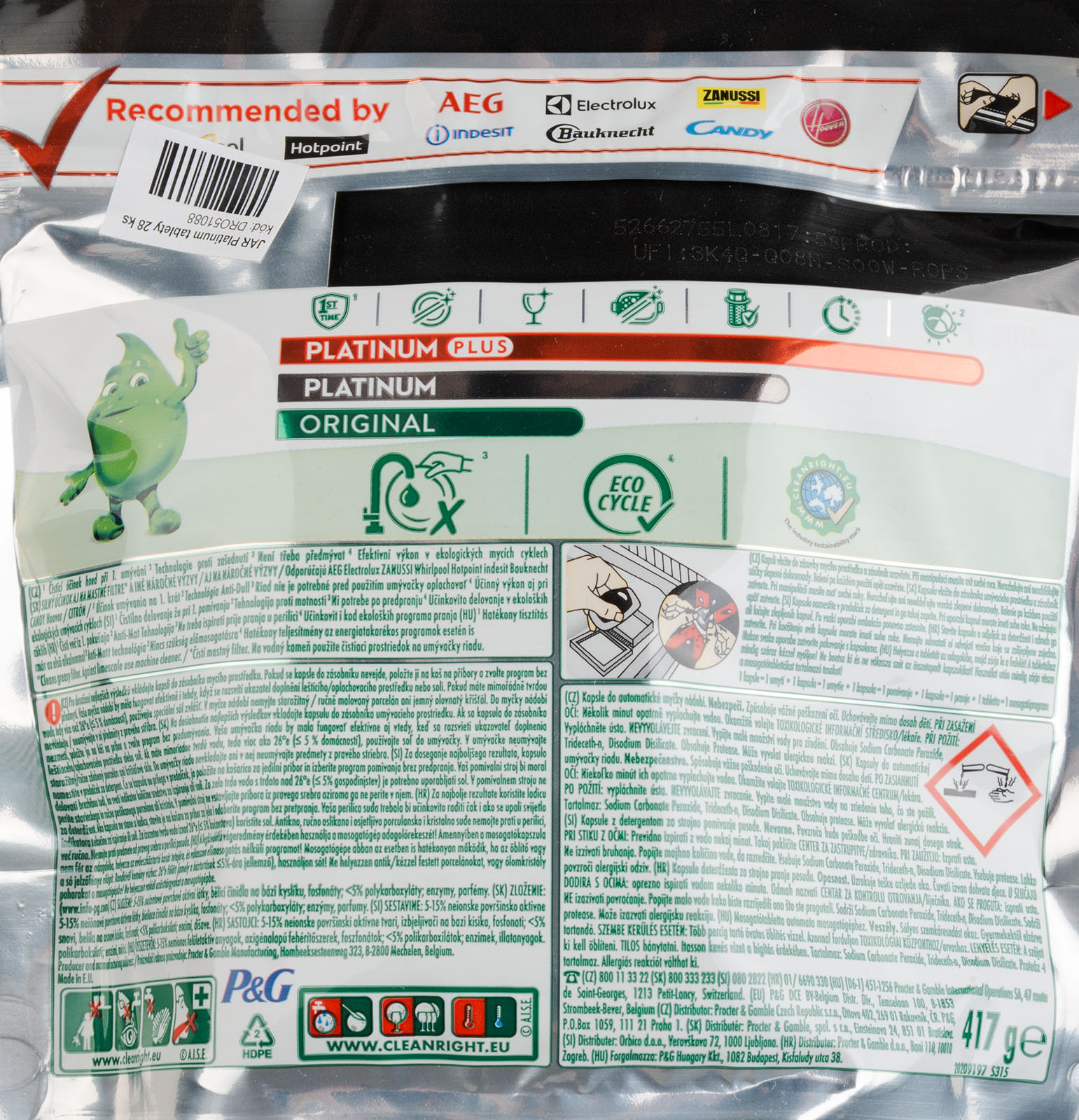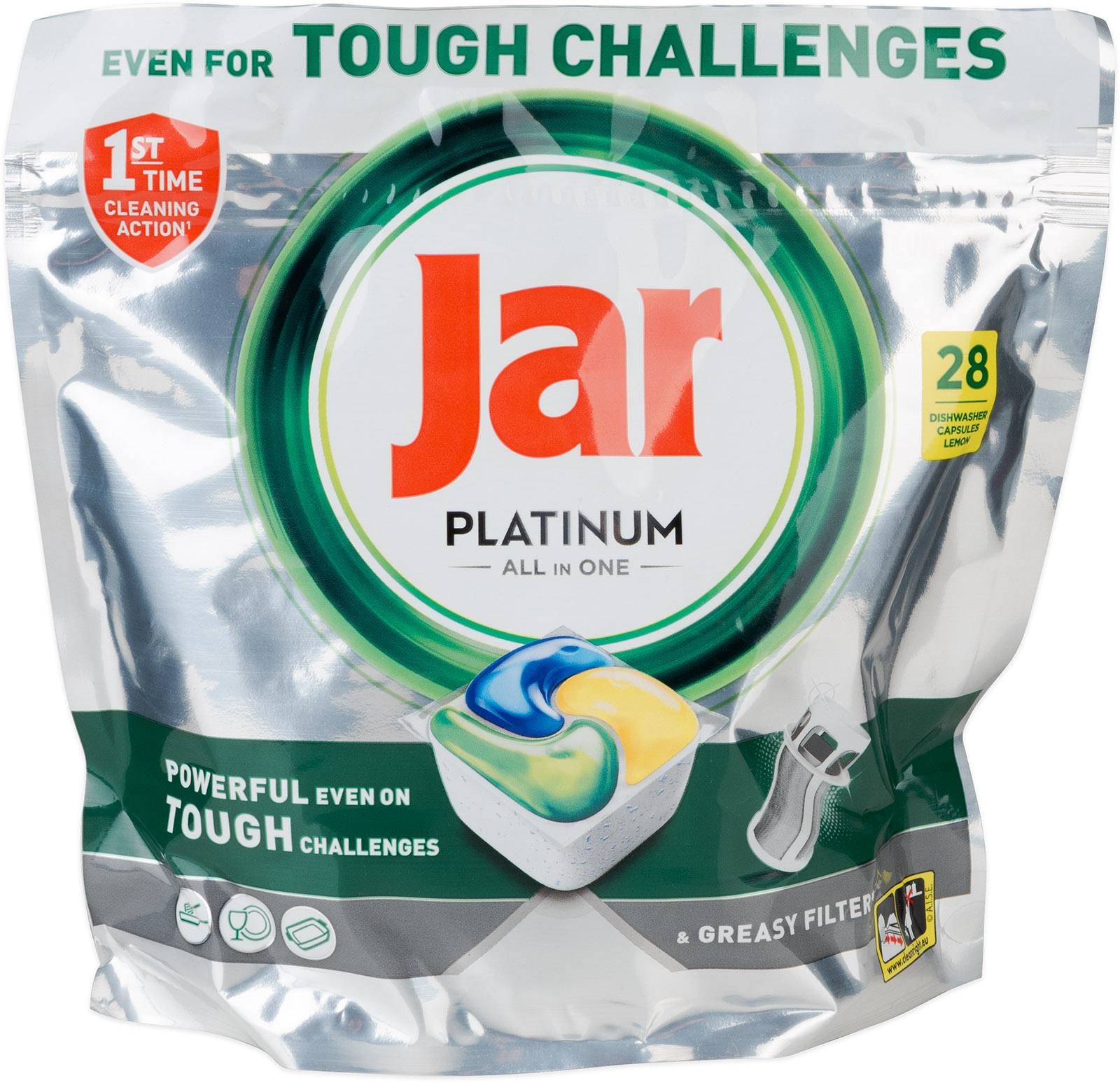JAR Platinum tablety 28 ks, tablety, které se nerozbalují, účinek již při 40°C, tekutá část kapsle se silným odmašťujícím účinkem, obsahuje již oplachovač, nádobí zanechá lesklé, změkčující sůl zanechá sklo beze skvrn, prášková část kapsle má funkci namáčení, její rychlá rozpustn celý popisost zajistí dokonalé odstranění odolných skvrn i od čaje. Spotřebujte do 18ti měsíců od data výroby uvedeném na obale.