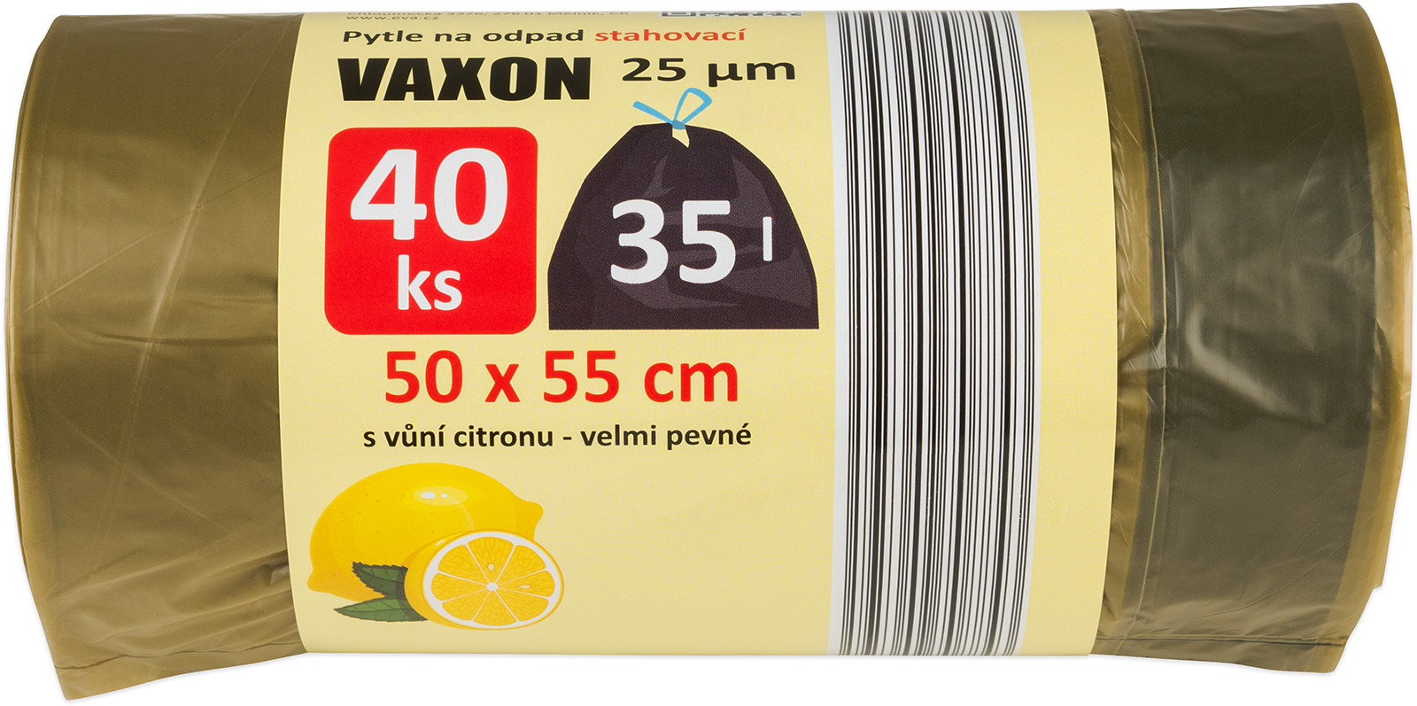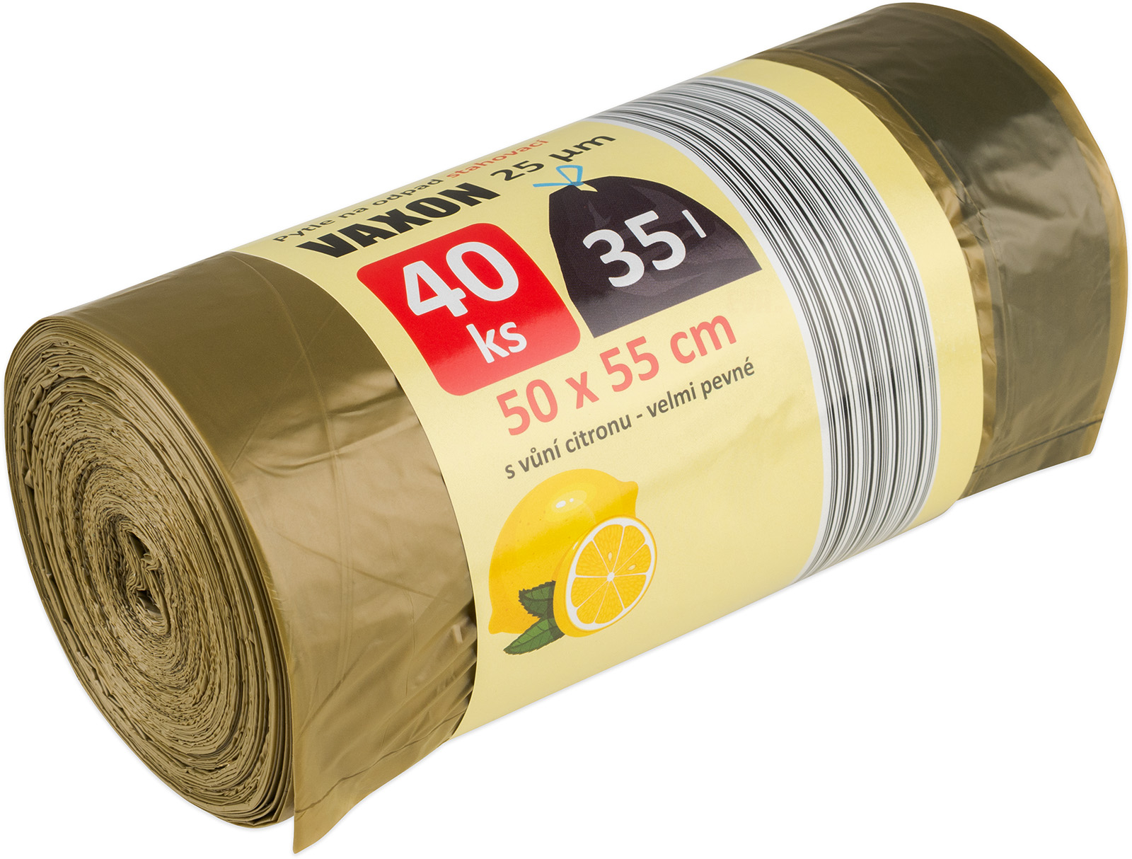 40 pevných stahovacích pytlů na odpad Vaxon o objemu 35 litrů s vůní citronu, rozměry: šířka 50 cm, výška 55 cm, síla 25 µm, barva khaki
