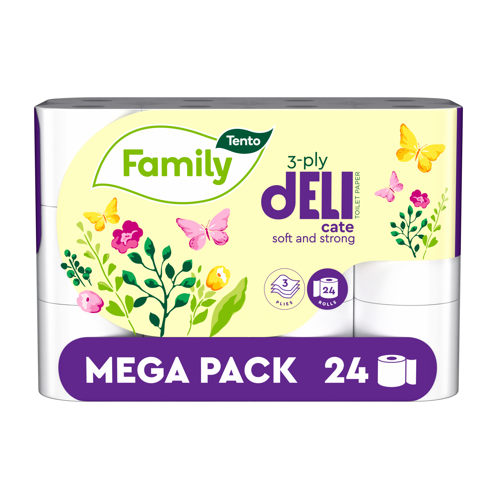 Toaletní papír TENTO Family Delicate, 24 rolí, návin 14,04 m, rozměr útržku 12 x 9,5 cm, gramáž 3 x 15,5 g/m2. 100% celulóza. Řada Tento Family je zde pro všechny, kdo hledají pro svou domácnost jednoduché a spolehlivé produkty.