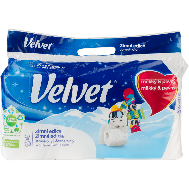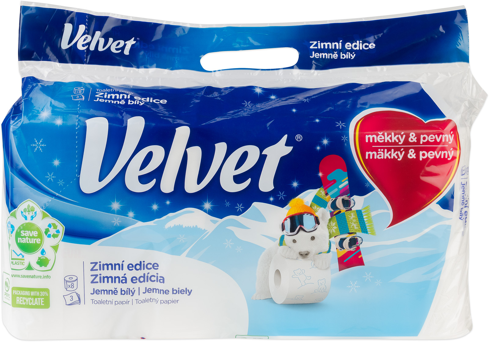 Toaletní papír Velvet Zimní edice, který je vyrobený ze 3 vrstev jemně hedvábného papíru, je neobyčejně pevný, přesto měkký. Je vyroben udržitelným způsobem, který šetrně využívá zdroje a chrání tak přírodu pro nás i budoucí generace, má PEFC certifikát. Návin 146 m, gramáž 3 x 1 celý popis5 g/m2, 150 útržků - rozměr 12 x 9,5 cm. 2 varianty ražby - medvídek nebo kytička.