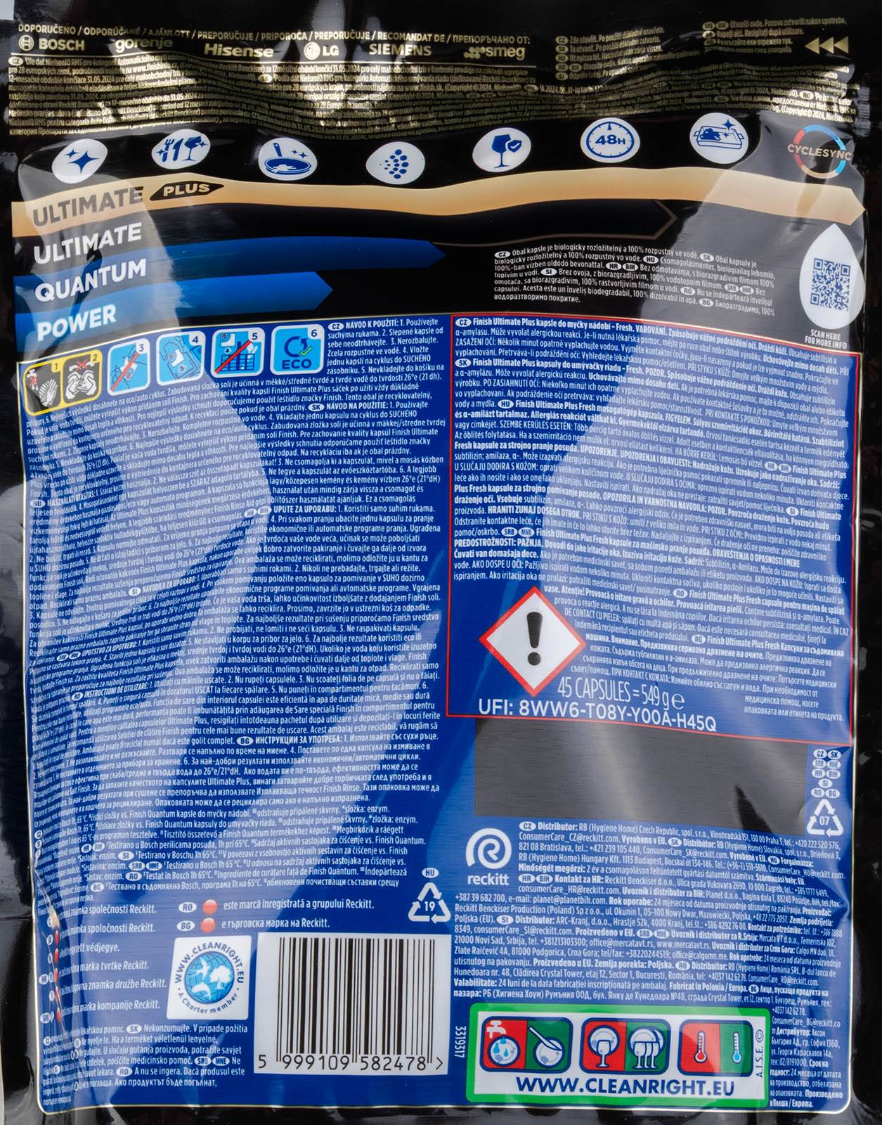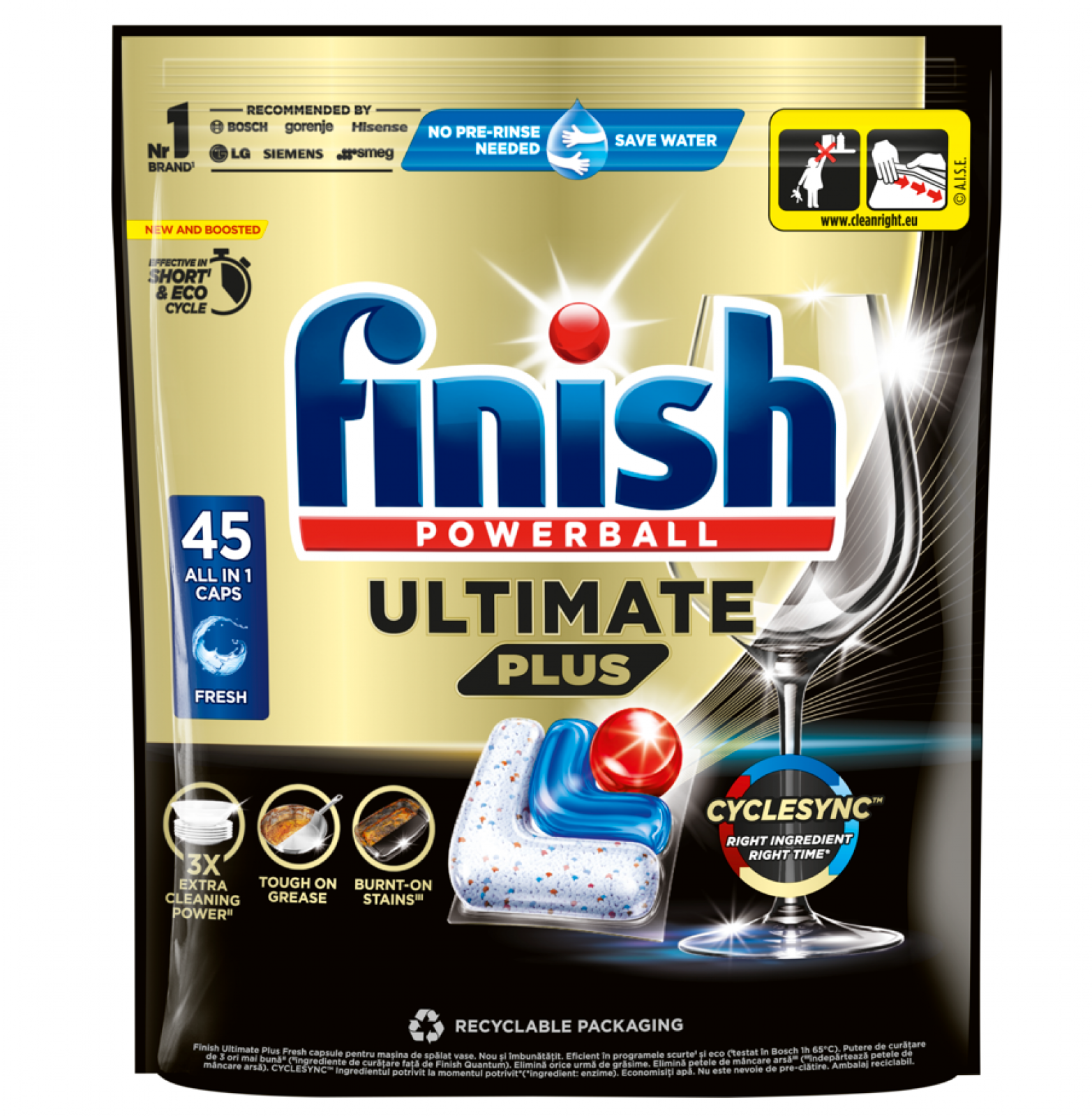 Finish Ultimate All in 1 Plus kapsle do myčky nádobí dodají vašemu nádobí dokonalou čistotu a lesk. Jedná se o první kapsle s technologií, která uvolňuje enzymy ve správný čas. Pokročilé složení si poradí i s odolnými skvrnami bez nutnosti předmývat a přináší 4 akce v průběhu cel celý popisého mycího cyklu. Kapsle chrání a pečují o skleněné nádobí a příbory a udržují jejich lesk s každým mytím. Revoluční výkon s o 15 % nižší hmotností chemikálií v porovnání s tabletami Finish Power All in 1. Ultimate All in 1 Plus kapsle do myčky nádobí od značky Finish obsahuje pečující látky, které pomáhají chránit vaše sklo před korozí a zakalením.