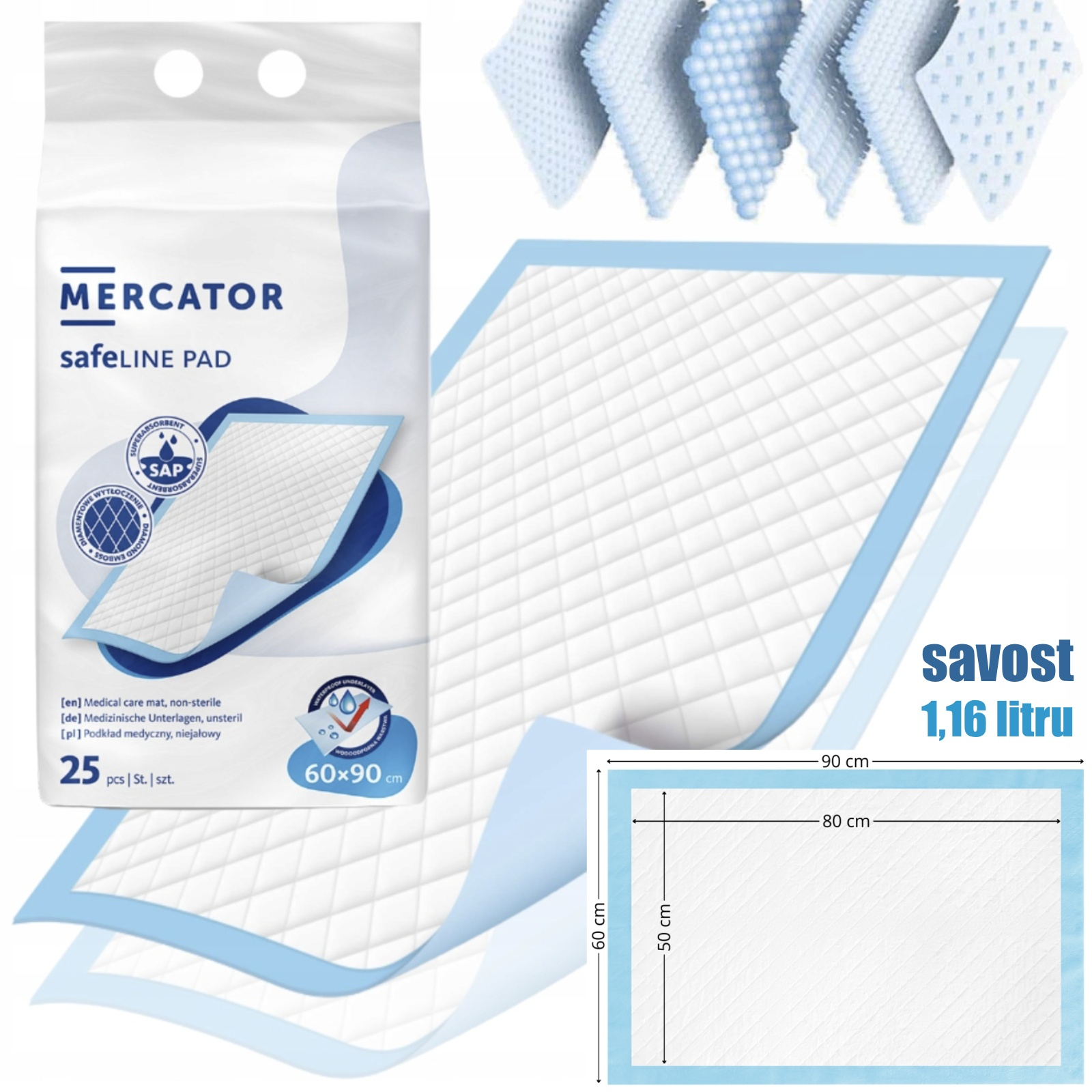 Absorpční inkontinenční podložka Mercator o rozměrech 60 × 90 cm (EAN kód 6976128169414) patří mezi vysoce efektivní hygienické pomůcky díky svému složení a přítomnosti superabsorbentu.