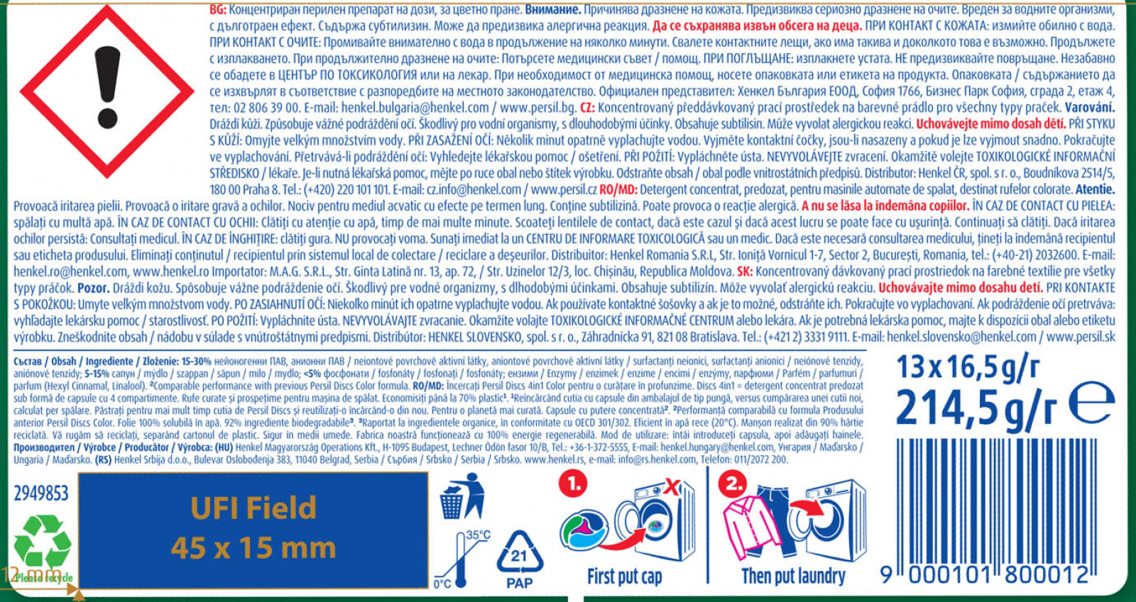 Persil Discs prací kapsle se silou 4 komor, které zároveň poskytují i 4 silné benefity. Unikátní směs Persil enzymů nejenže působí i proti těm nejodolnějším skvrnám a poskytuje perfektní výsledky praní, ale zároveň vaše prádlo rozzáří, pečuje o látky a poskytuje dlouhotrvající sv celý popisěží vůni - 4 síly v 1 Discu pro hloubkovou čistotu.
