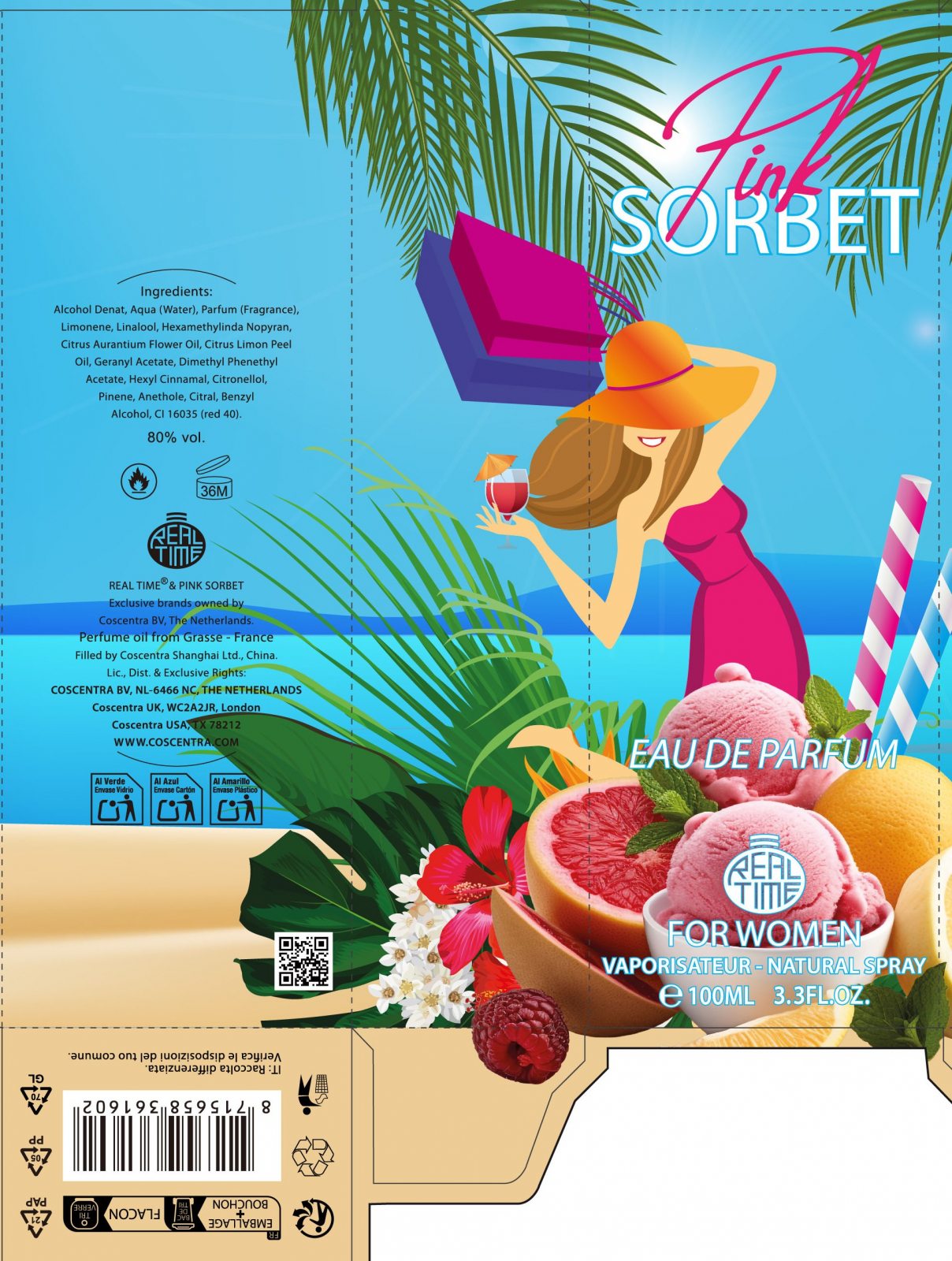 Aromatická a svěží květinová vůně pro ženy, která se otevírá ovocnou směsicí citrusů a hrušek. Srdcem prostupují vodní a květinové tóny, vodní meloun a mořská sůl. Závěr vůně je tvořen pralinkou, pižmem a ambrou. Inspirováno Escada - Sorbetto Rosso.
