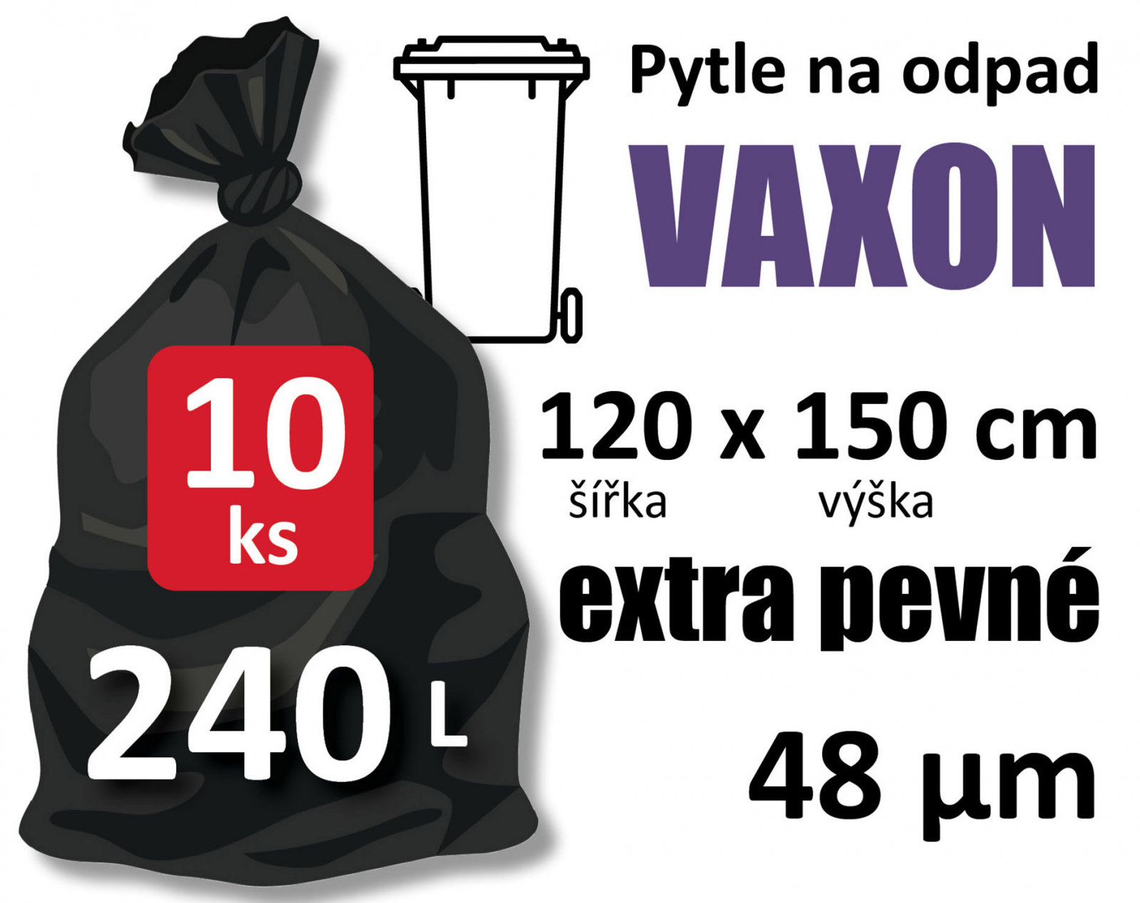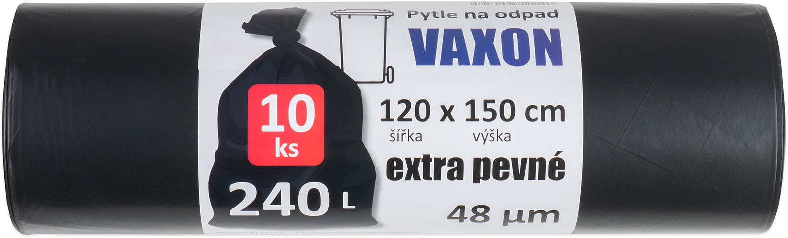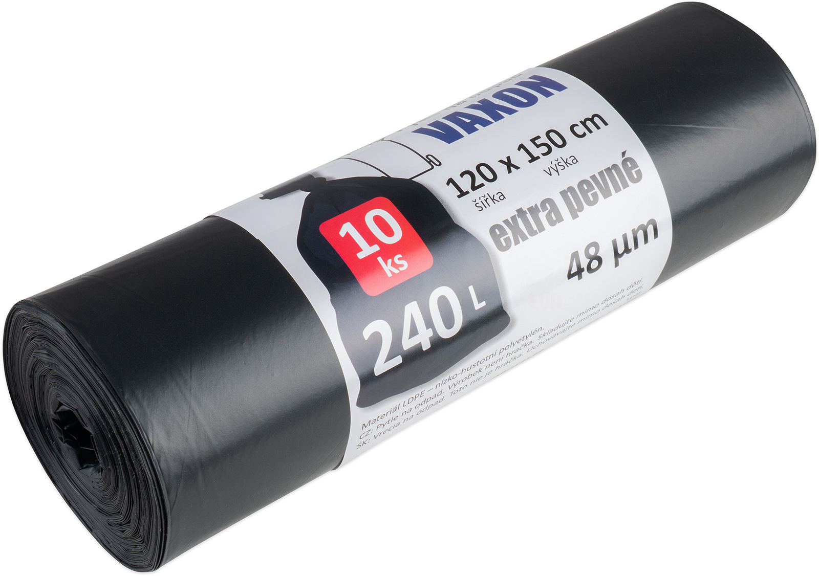 10 ks vysoce odolných černých pytlů na odpad, síla 48 µm, rozměry: šířka 120 cm, výška 150 cm, objem 240 litrů.